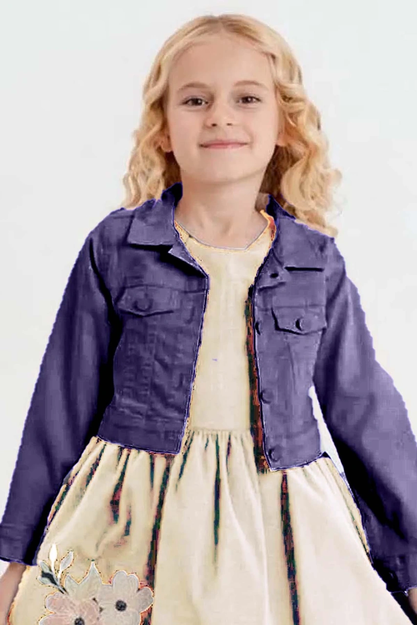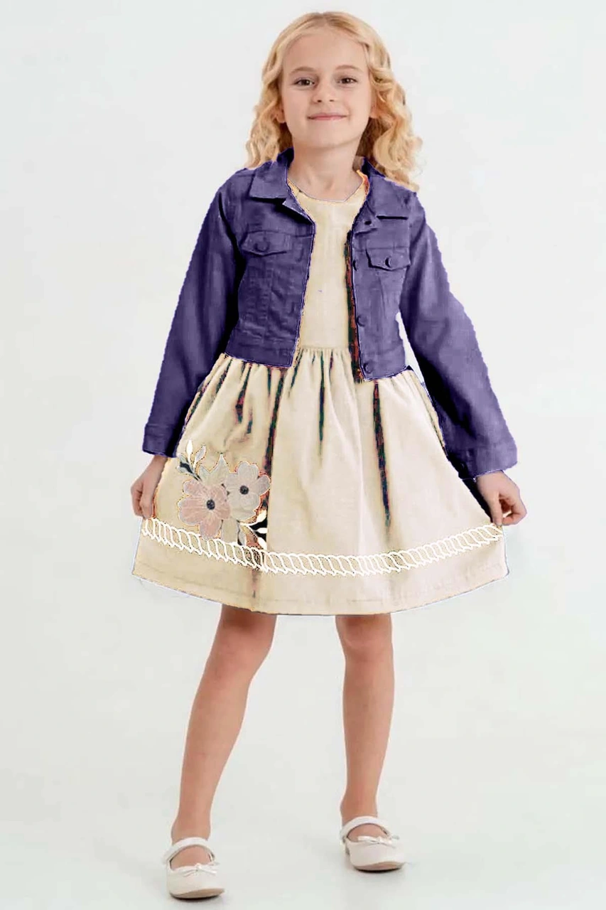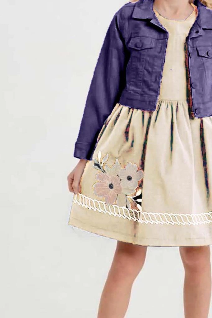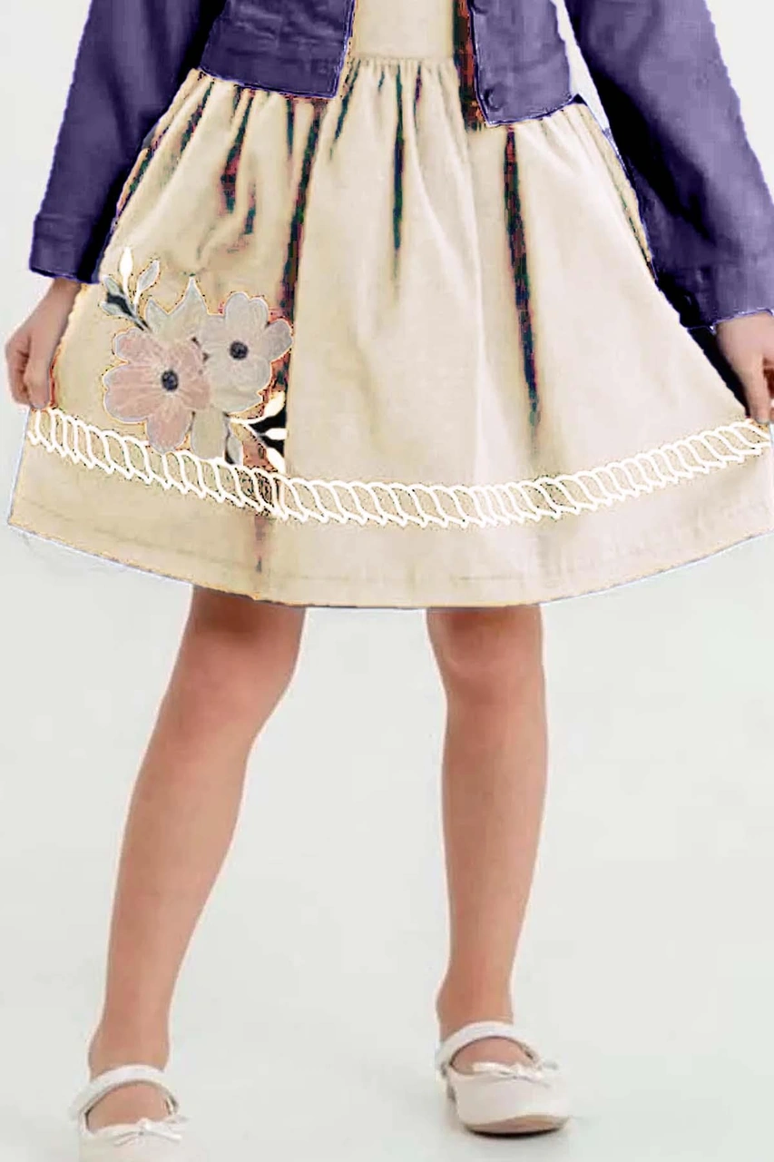 Riccotarz Kız Çocuk Üzerinde Jeans Ceket Ve Çiçek Dikiş İşlemeli Krem Elbise Krem