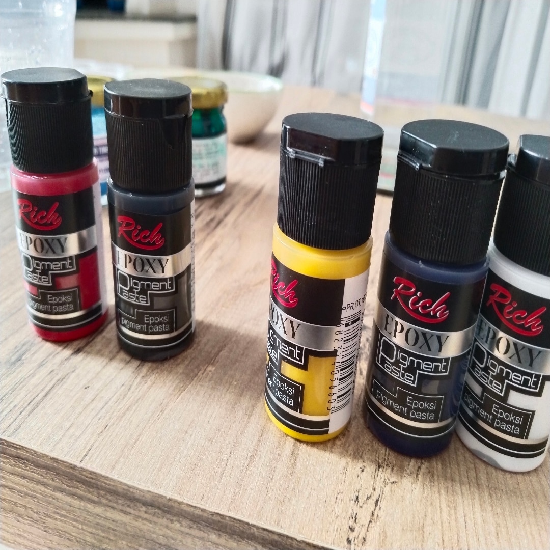 5 renk satın aldim ve hemen epoksi de denedim. 3 ü cok başarılı renkler doygun ve kıvamlı. kullanımı damlatma kapak ve rahat. ( huni kapak değil) boyalarda kırmızı ve siyah bozuk çıktı uzun suredir farkli markalarda da pigment boya kullanıyorum ilk defa katı hic akmayan hatta ahşap çubukla bile kullanılmayan bir biya gördüm onların değişimini talep edicem ve ona gore magazayı puanlıycam. ama diğer 3 ü gerçekten başarılı.