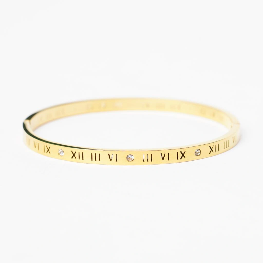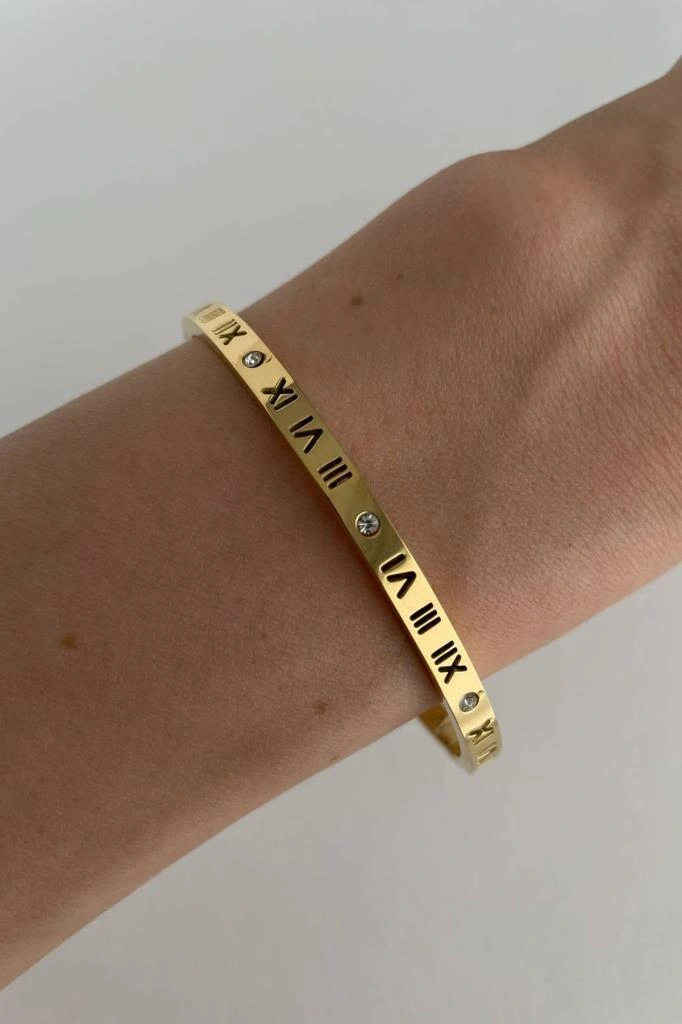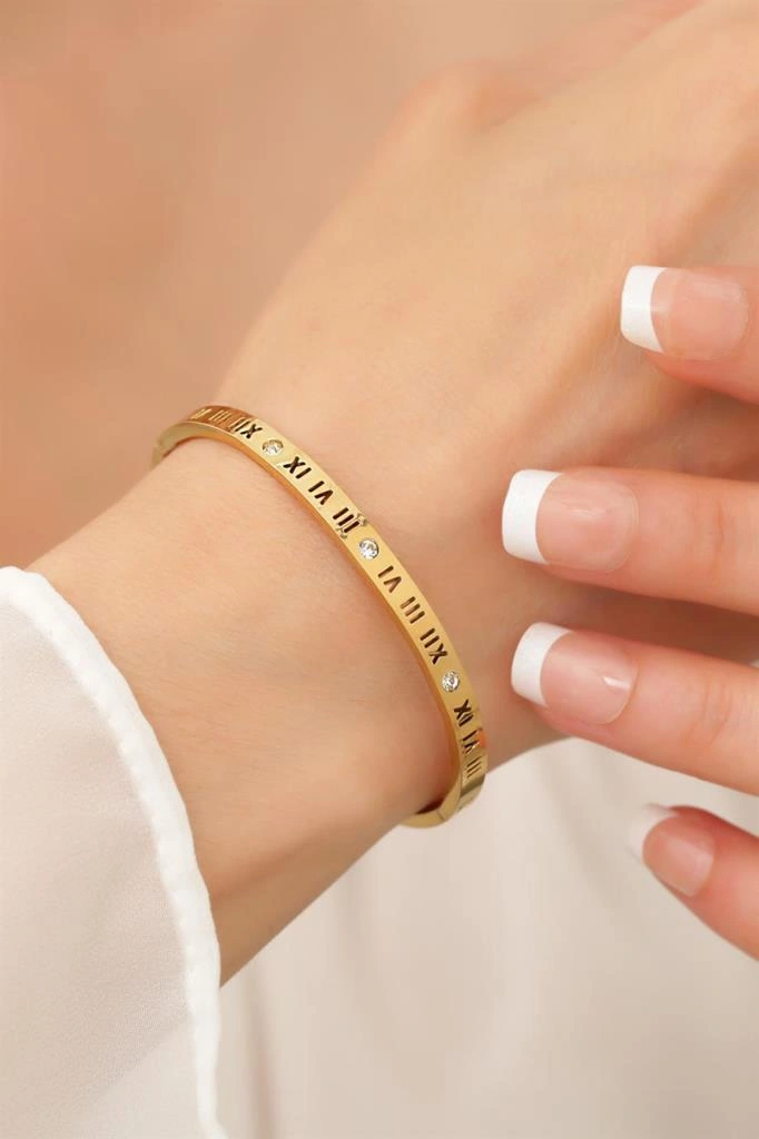 Roma Rakam İnce Taşlı Altın Çelik Bileklik Altın