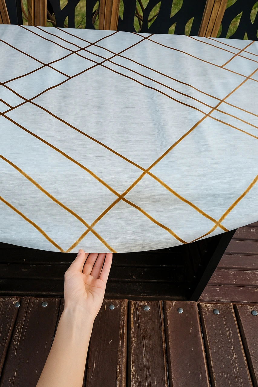 Rona Home Bej Kırık Beyaz Gold Şerit Desenli Masa Örtüsü Silinebilir Lüks Muşamba Sofra Bezi Bej