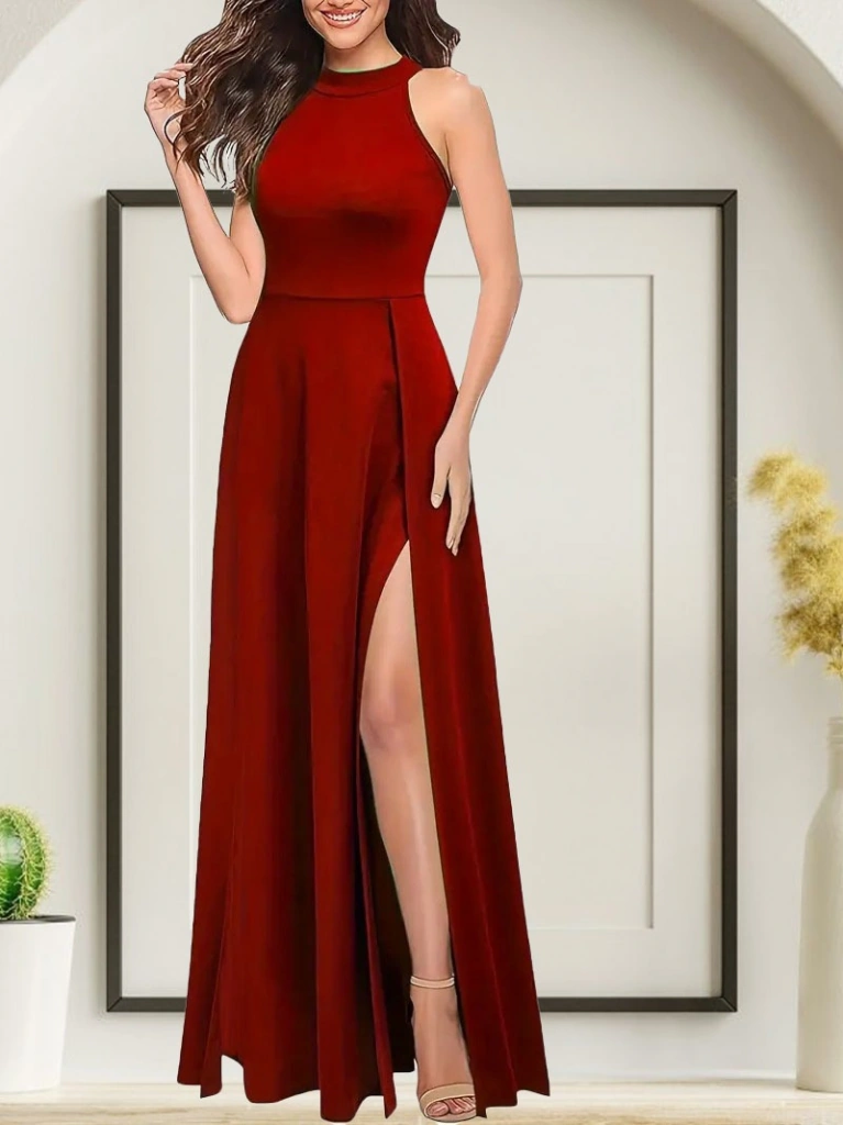 S-pazarım Kadınhalter Yaka Derin Yırtmaç Detaylı Tam Boy Ithal Krep Abiye Elbise Kırmızı