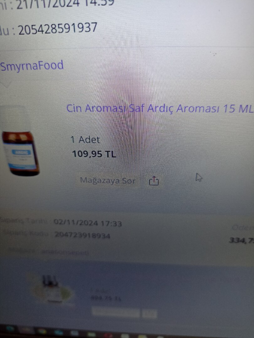 hafitten cini andıran bir kokusu var ama ürüne ekleyince parfüm gibi bir tadı var ,3 sınıf yapay aroma ya da gıda ürünü olmayan parfüm imalatı ürünü.Sonuç olarak kullanılamayacak kadar kötü çöp sipariş.yapamıyorsan satma arkadaşım iade göndereceğim onu da kabul etmezsin