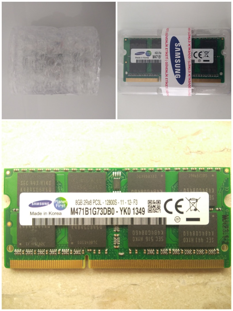 Patpata sarılı gönderilmiş. RAM'deki bazı çiplerin yazıları silinmiş bazısının numaraları farklı. Windows'un kendi bellek kontrol aracıyla kontrolümde sorun çıkmadı. Memtest86 ile 1/4 pass geçene kadar (2/4 oluncaya kadar) test ettim orda da sorun çıkmadı. 2015'in 26. haftası üretimli. Aynı RAM'in orijinaliyle kıyasında orijinalin çipi küçük numaralar aynı yazı silinmiyor bunun çipi büyük numaralar farklı yazı siliniyor. Devre kartı da farklı. Tüm görsellere masaüstü sürümünden ulaşabilirsiniz.