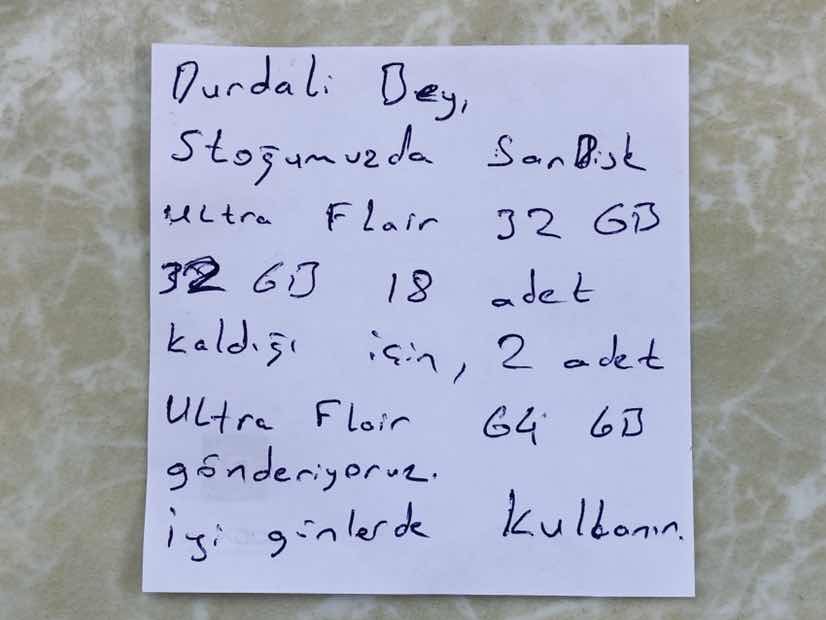 Mağazaya ilgi ve alakalarında dolayı çok teşekkür ederim. Paketleme özenliydi, 20 adet 32 gb flash bellek sipariş verdim ellerinde 18 adet kalmış iki tanesini 64gb göndermişler tekrar teşekkürler. Müşteri memnuniyetini ön planda tutan bir mağaza.
