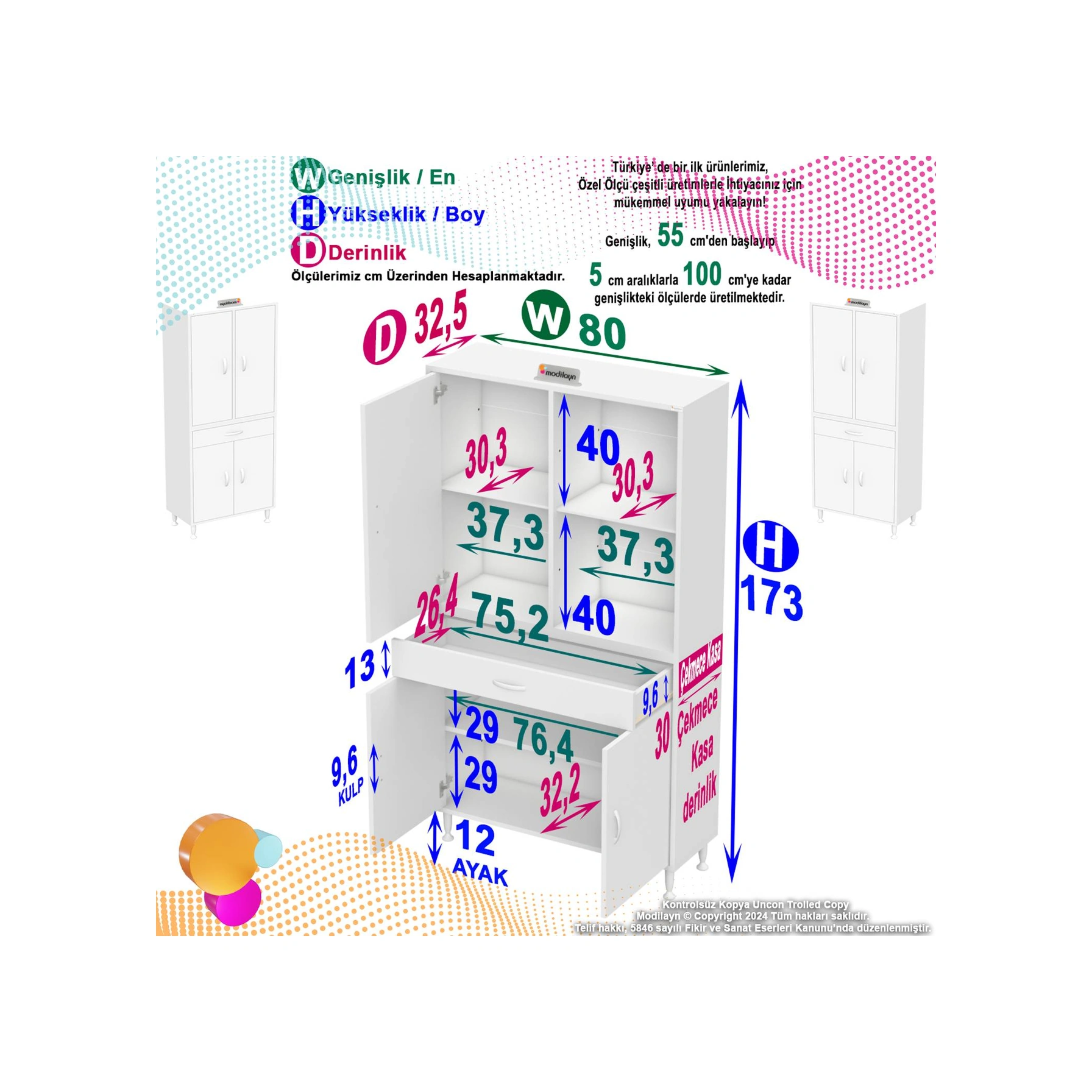 Sare Banyo Ve Mutfak Dolabı Çok Amaçlı Dolap Tek Çekmece 4 Kapak 3 Raf 6 Bölme 80x173x32,5 Cm Beyaz