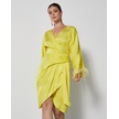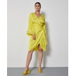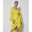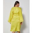 Saten Dokulu Tüy Detaylı Kruvaze Elbise Kuşaklı Ve Drapeli Özel Tasarım Sarı