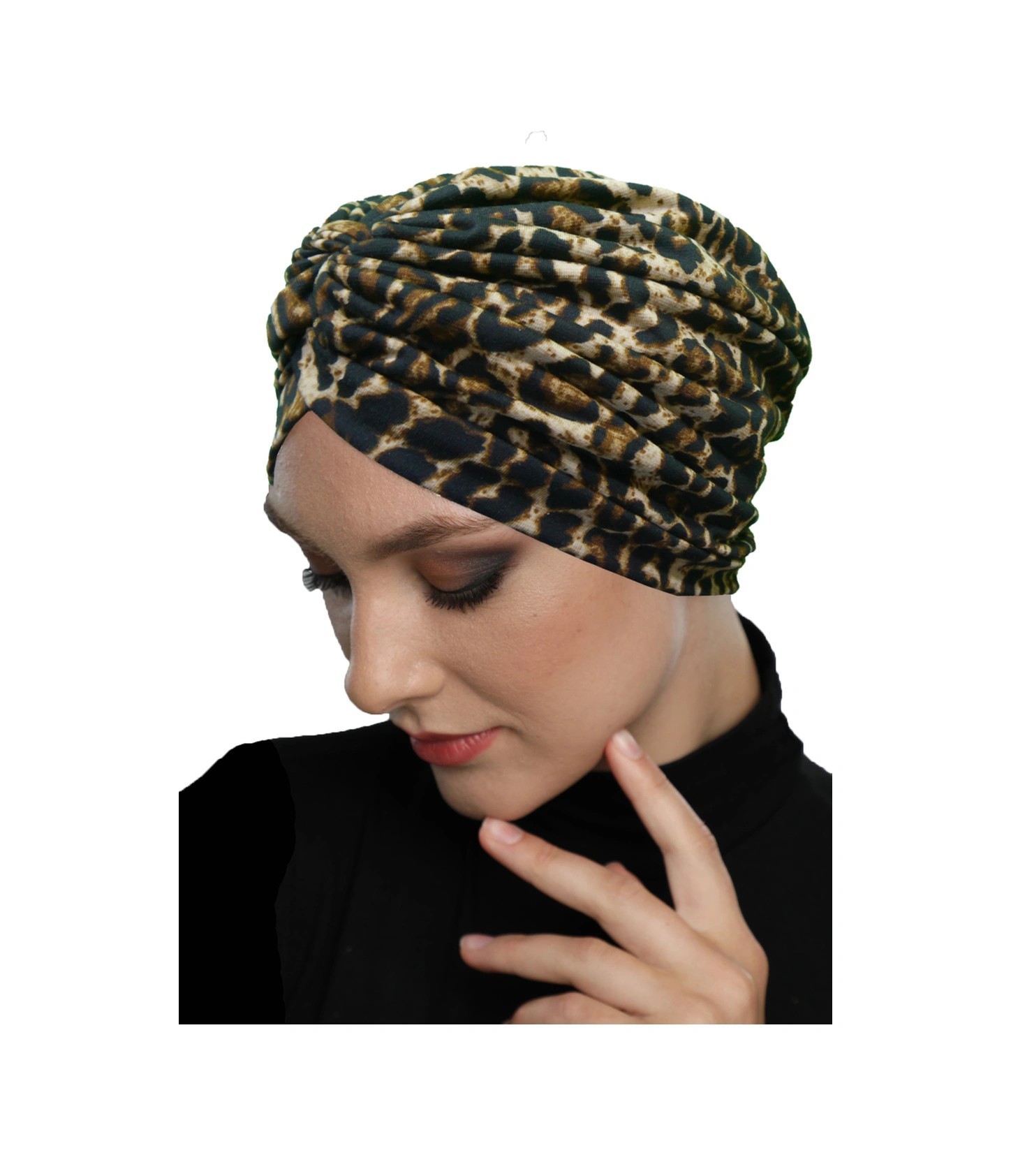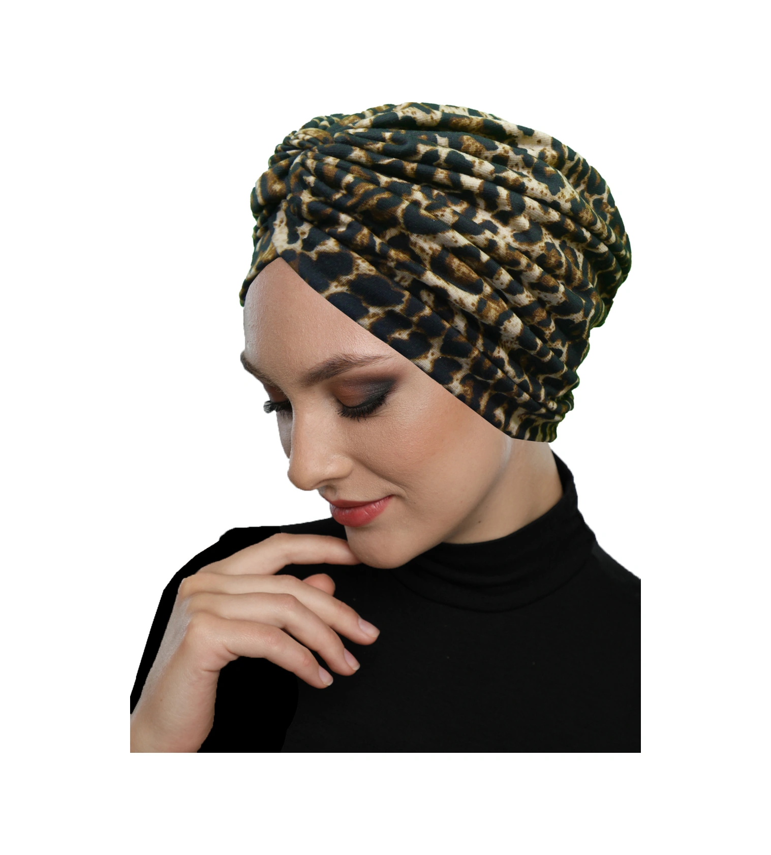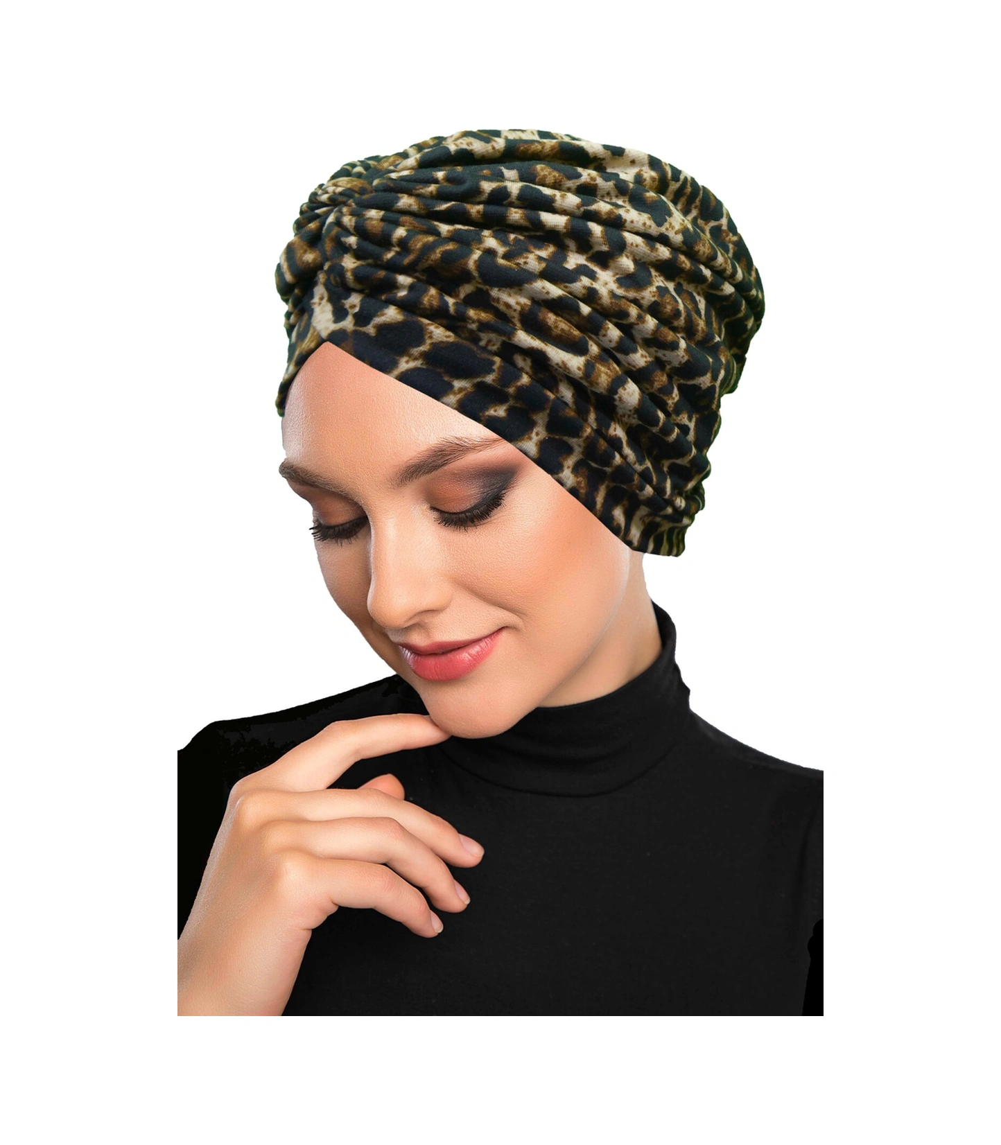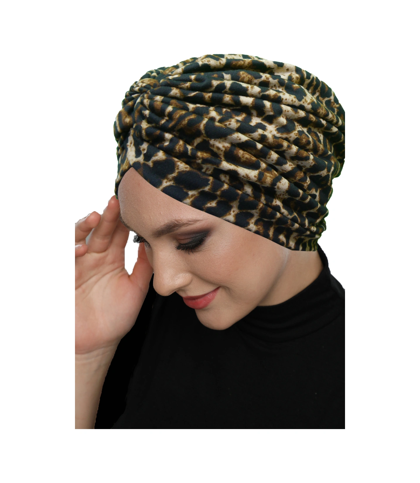 Savanna Vog Desenli Çapraz Ve Bant Detaylı Astarlı Hazır Türban Tesettür Havuz Bonesi Koyu Leopar