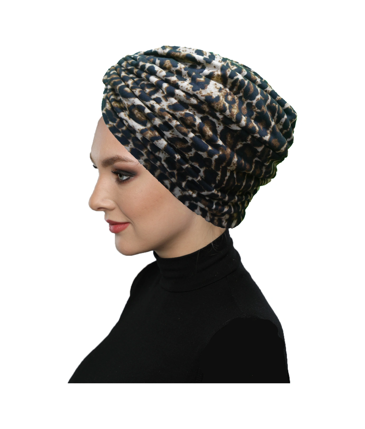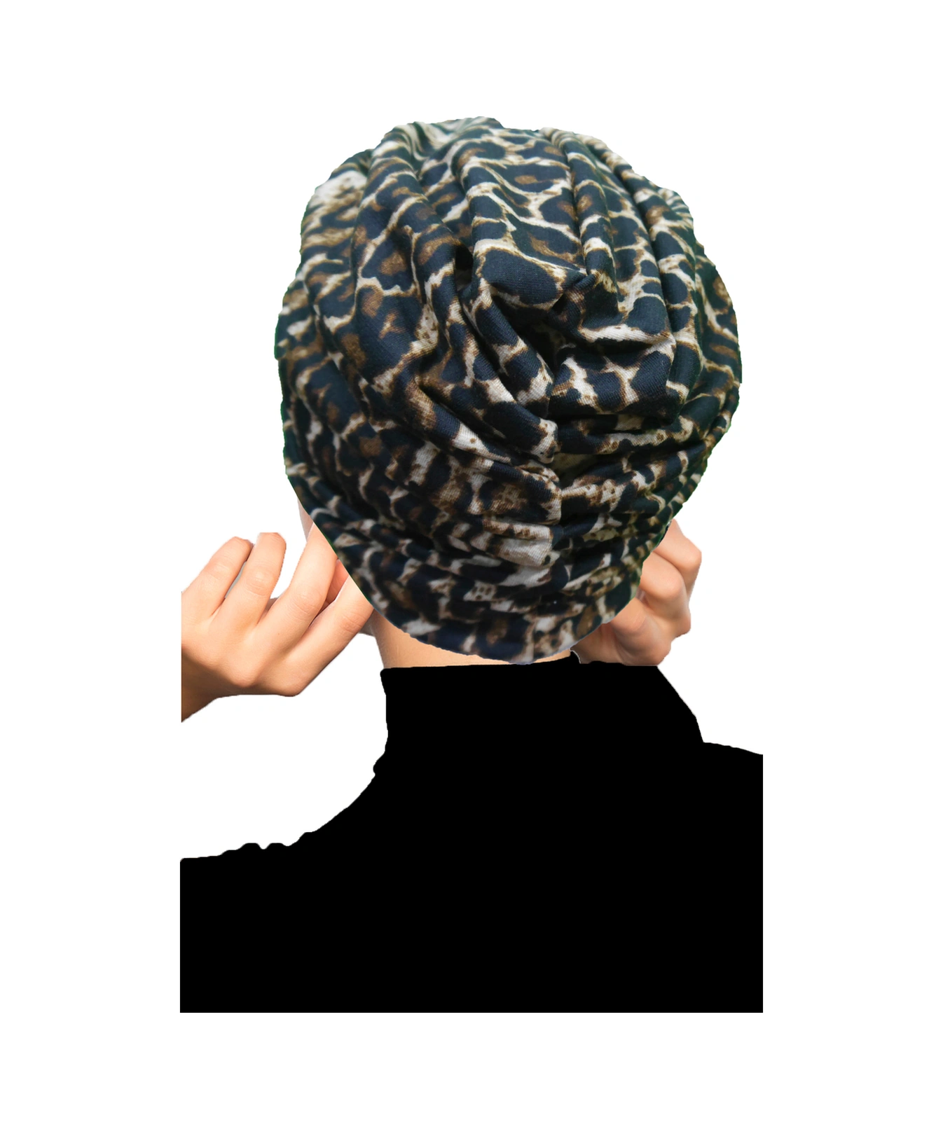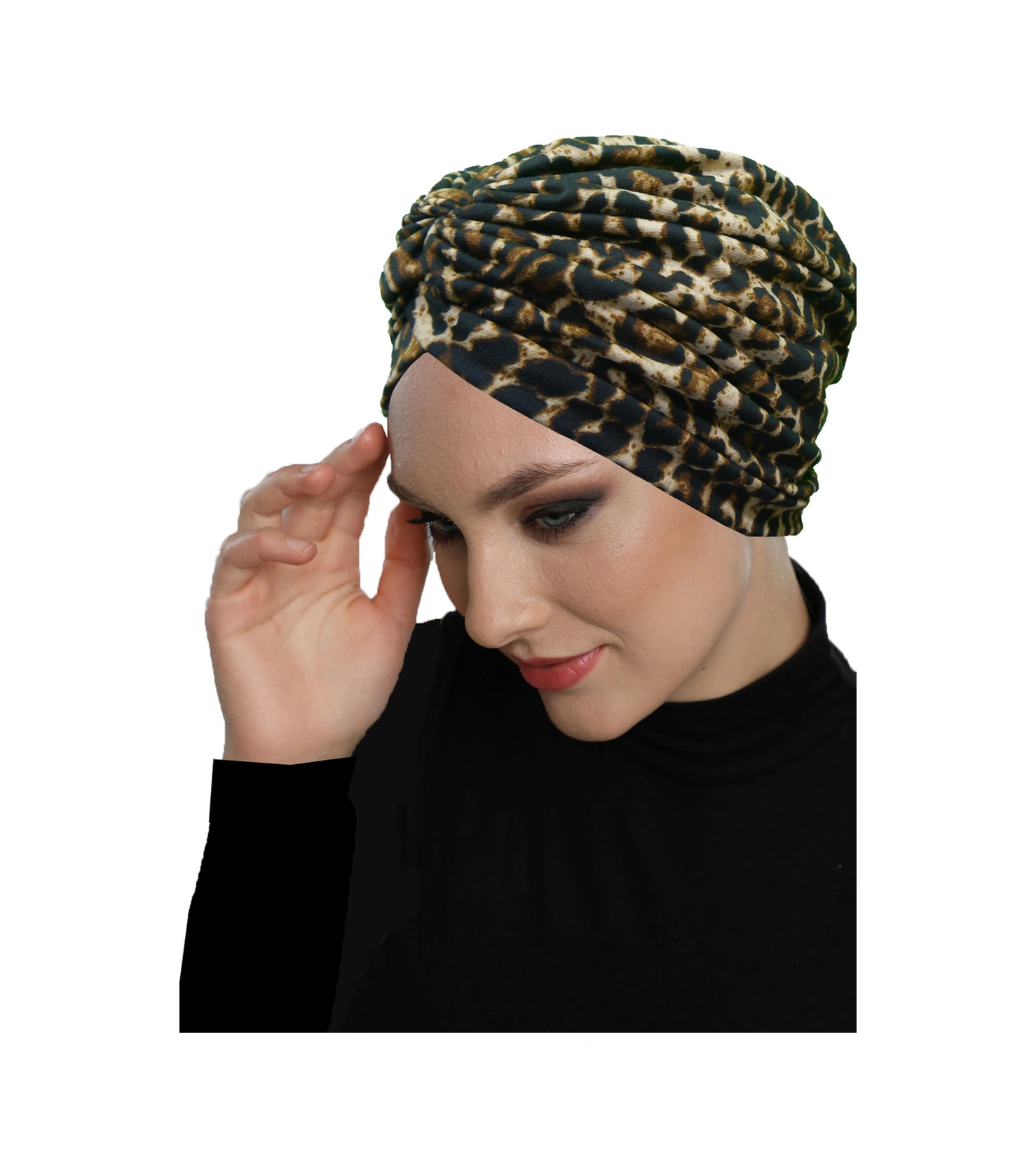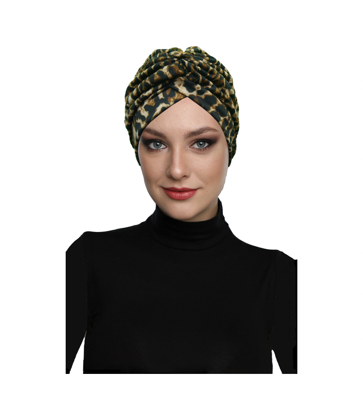 Savanna Vog Desenli Çapraz Ve Bant Detaylı Astarlı Hazır Türban Tesettür Havuz Bonesi Koyu Leopar