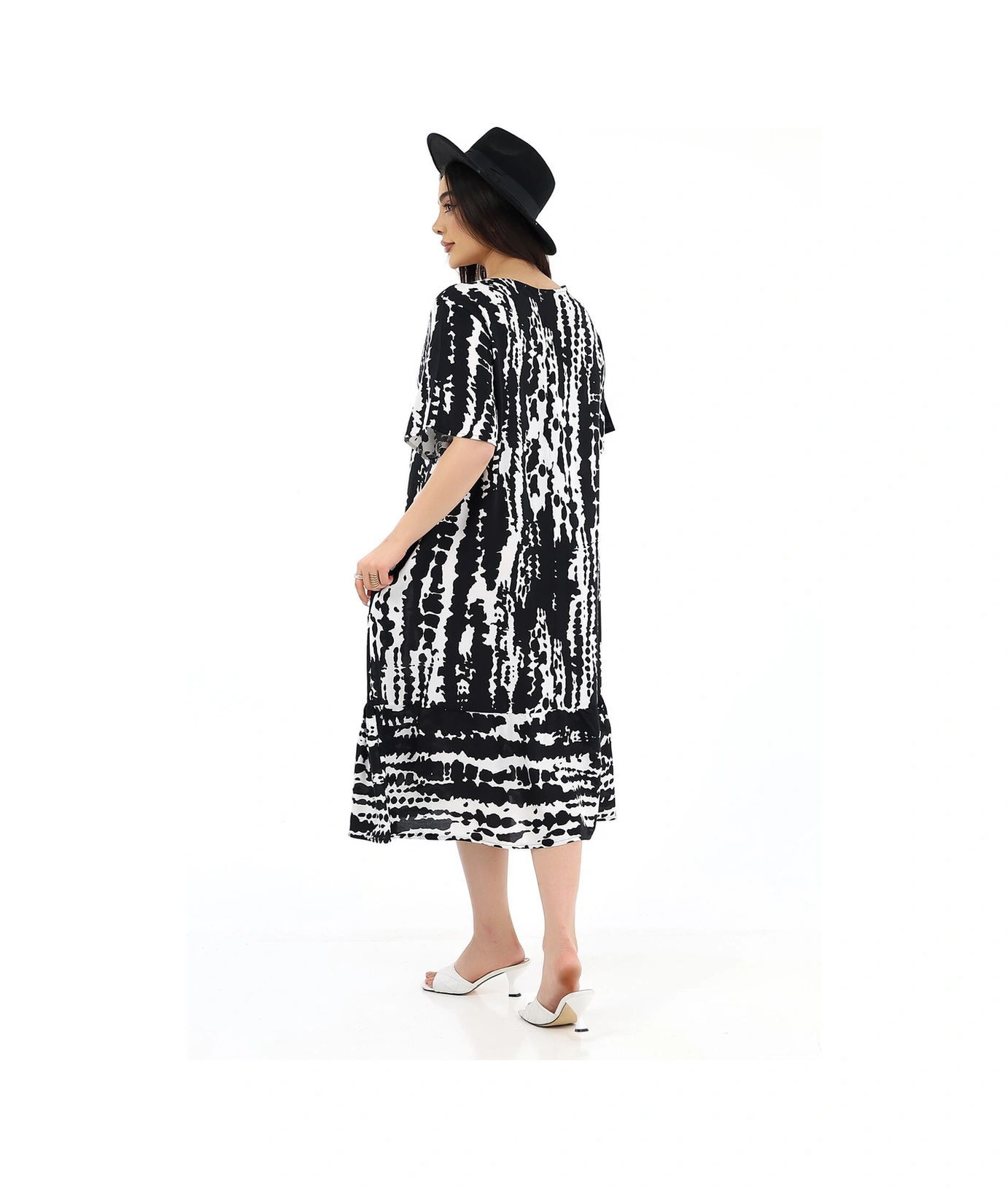 Schık Kadın Viskon Yarım Kol O Yaka Cepli Fırfırlı Elbise Siyah Siyah