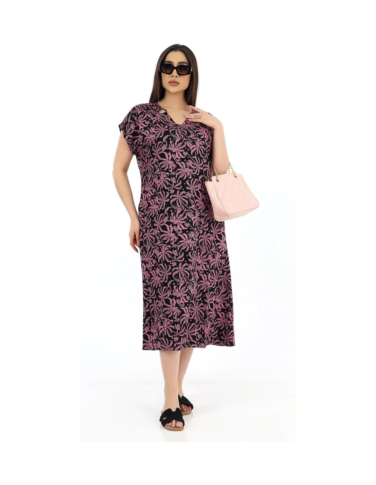 Schık Kadın Viskon Yarım Kol V Yaka Halkalı Cepli Elbise Pembe Pembe