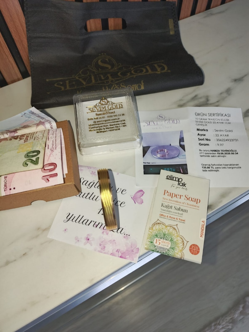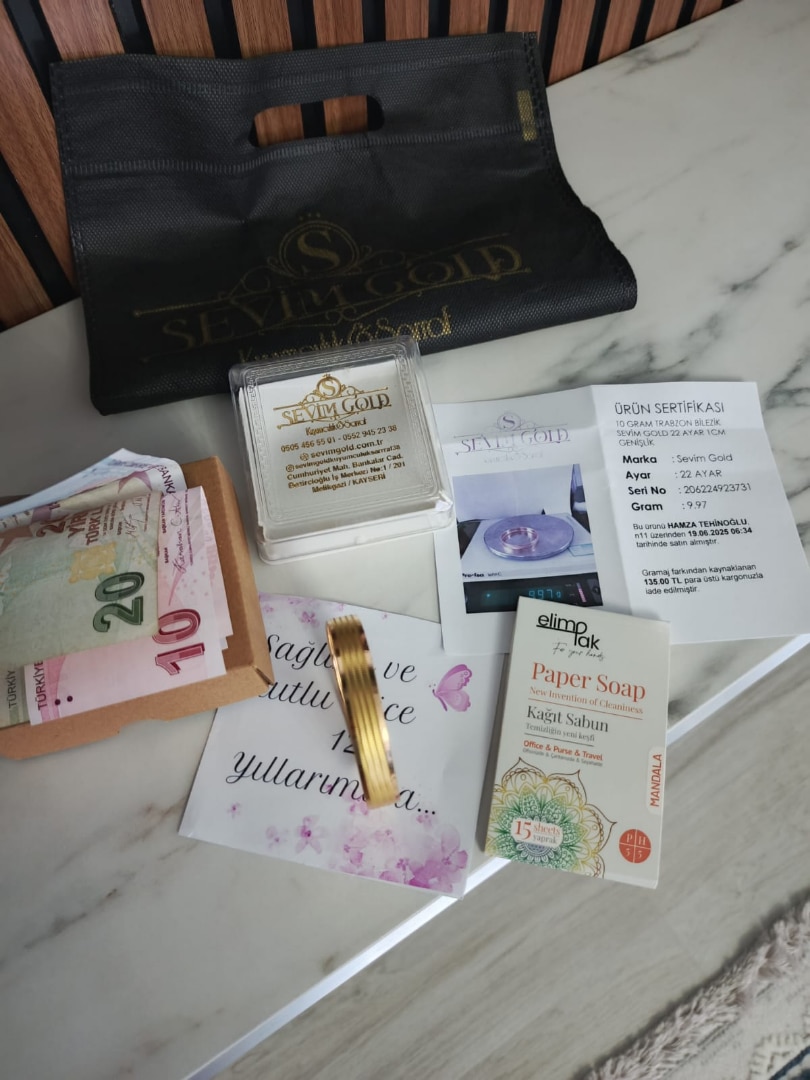 ben bu kadar işini seven ,ve müşteri memnuniyeti gözeten bir firma daha görmedim.bilezik çok güzel ,güven çok önemli,bir de hak hukuk gözetmeleri ... Eğer şüpheleriniz varsa hemen gideriyorlar...Sevim Gold bir ayrıcalıktır.Alın aldırın ...pişman olmazsınız ..Ben memnun kaldım