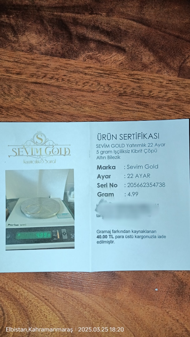5 gram diye dayanıksız bekledim ama eğilip bükülme yapmıyor kolda çok kibar ve tatlı durdu. Eksik gelen gram tutarını nakit olarak iade eklemişler içine. Çok ince olduğu için bileziğin iç tarafında ayar ve marka damgası tak çıkmamış ama dert değil. Devamı gelsin inşallah.