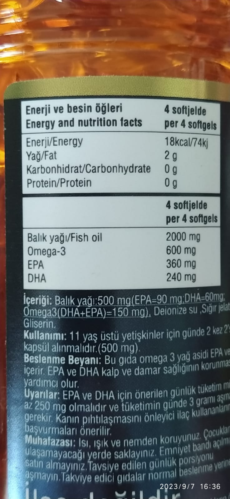 500 mg diye değerlendirip aldım meğer içerik çok zayıfmış. 1 kapsülde 150 mg omega3, 90 mg EPA, 60 mg DHA içermektedir. Günde 4 kapsül alınmalı. bu durumda çok pahalıya geliyor.