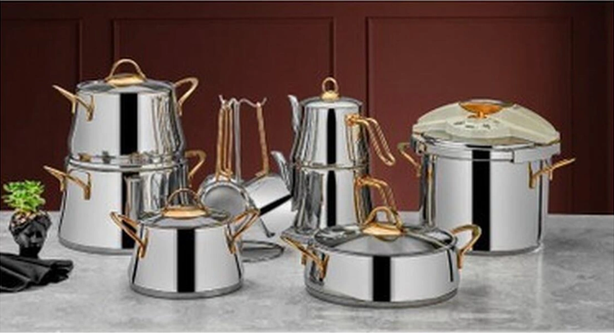 Sıla 18 Parça Piramit Gold Detaylı Tencere Takımı Düdüklü Tencere Çaydanlık Cezve Çeyiz Seti Bakır - Siyah