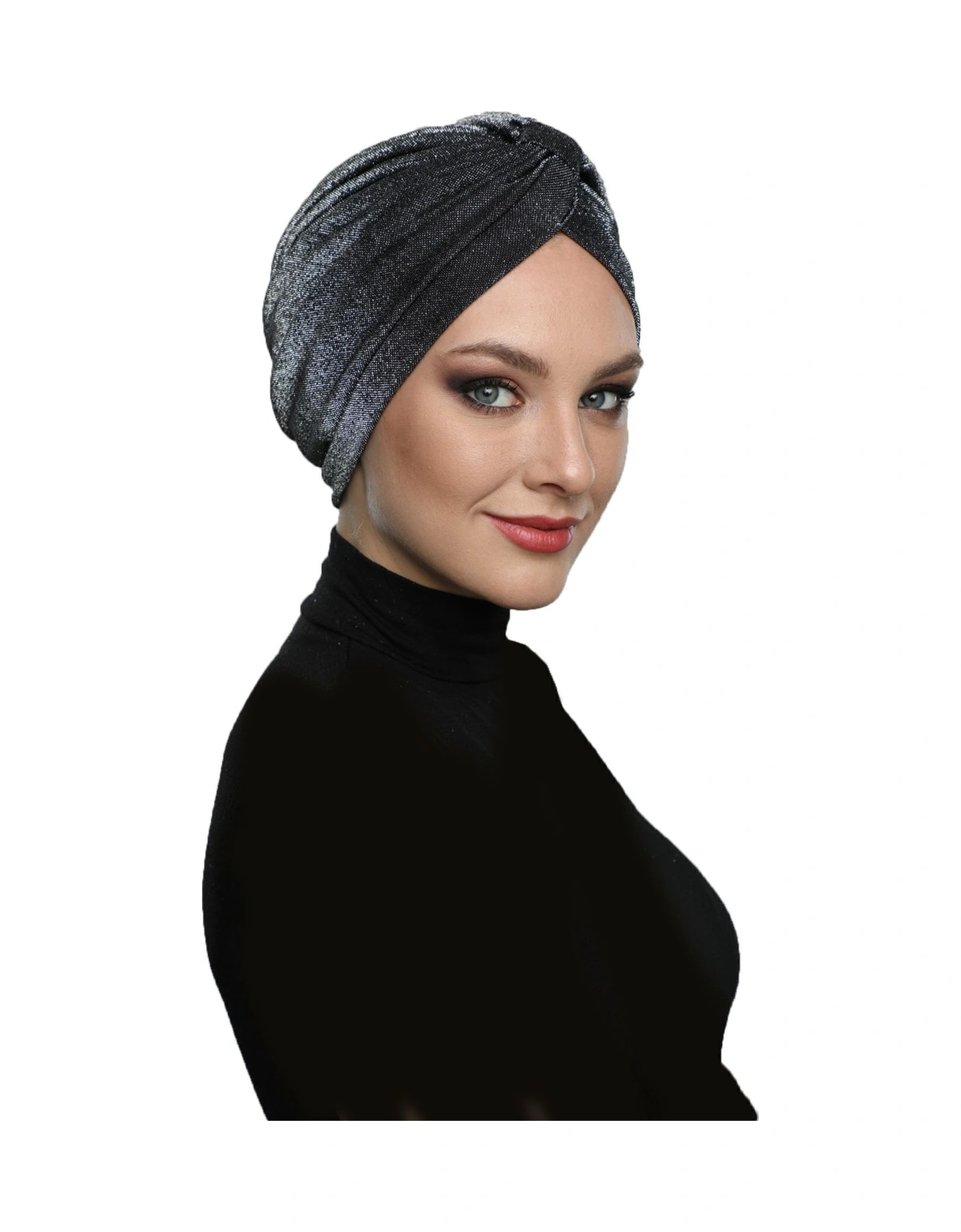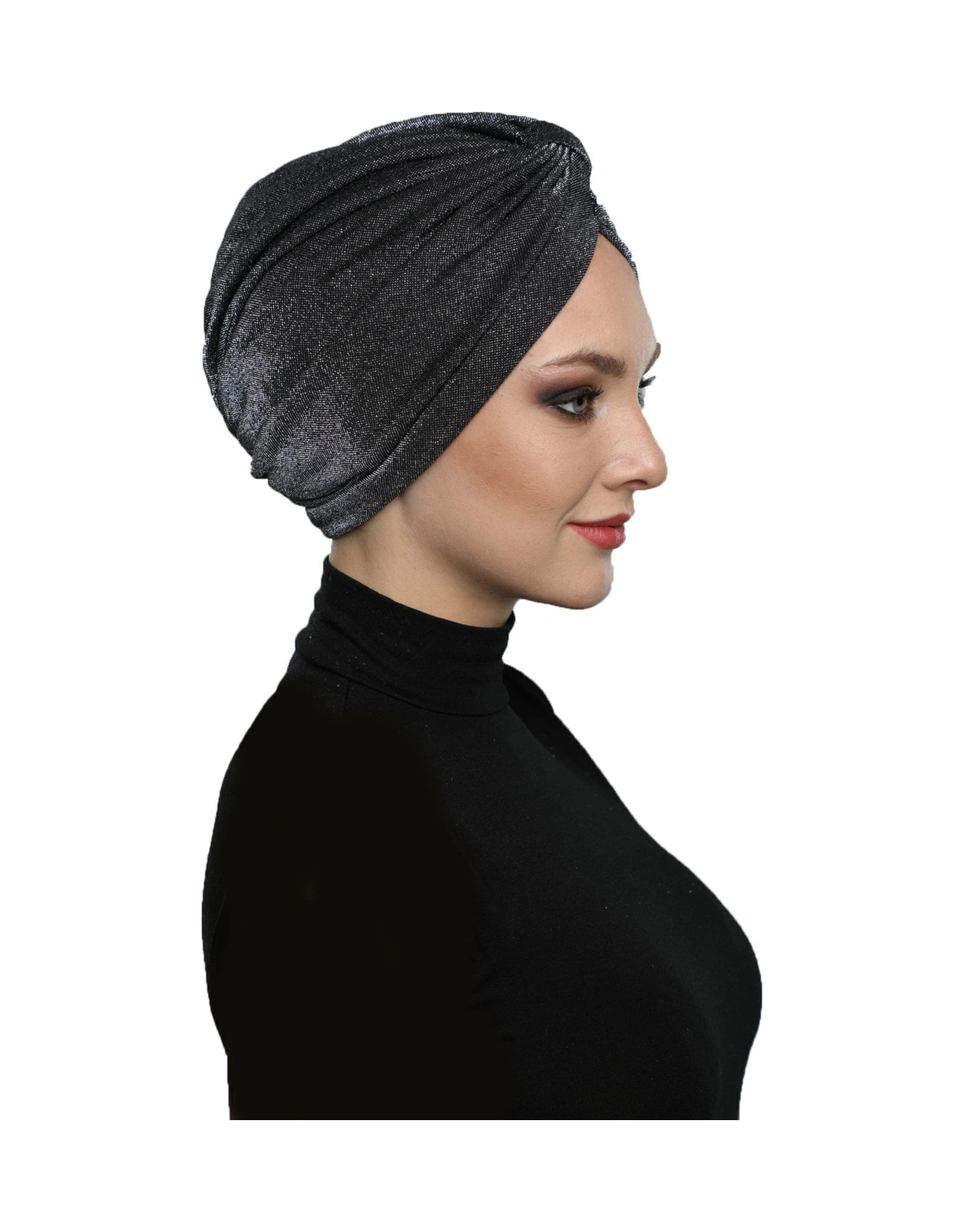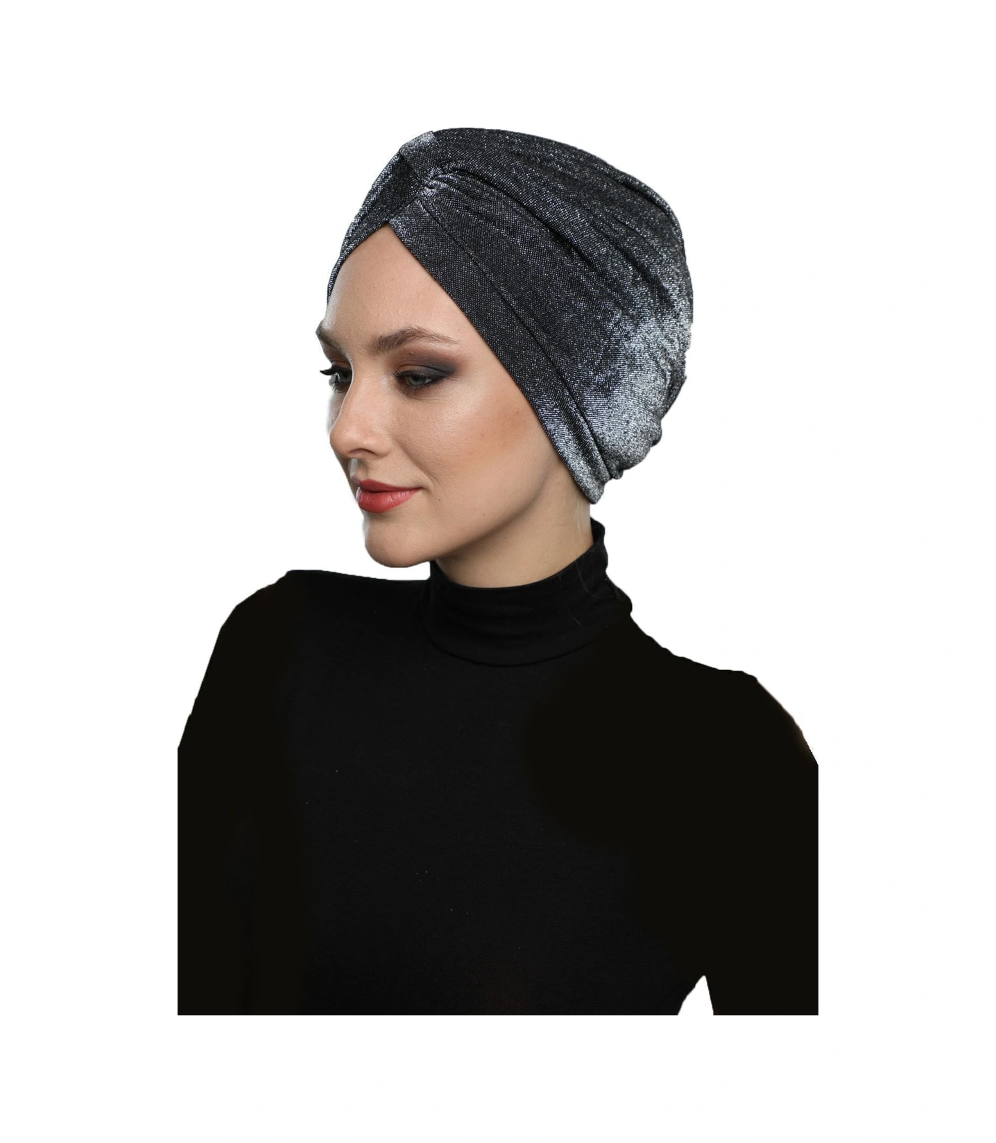 Simli Pike Çapraz Bantlı Astarlı Siyah Gümüş Hazır Türban Tesettür Bone Abiye Siyah-gümüş