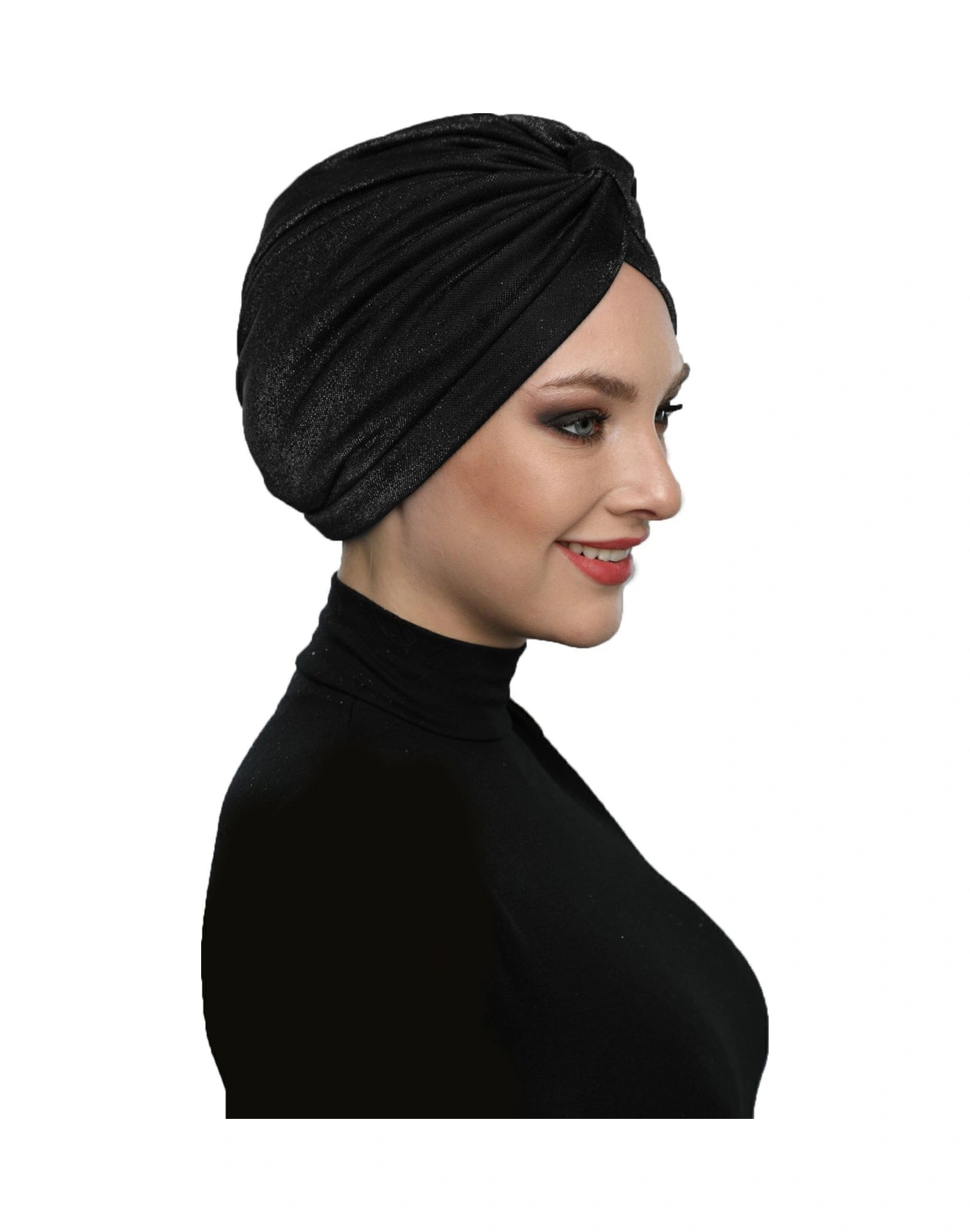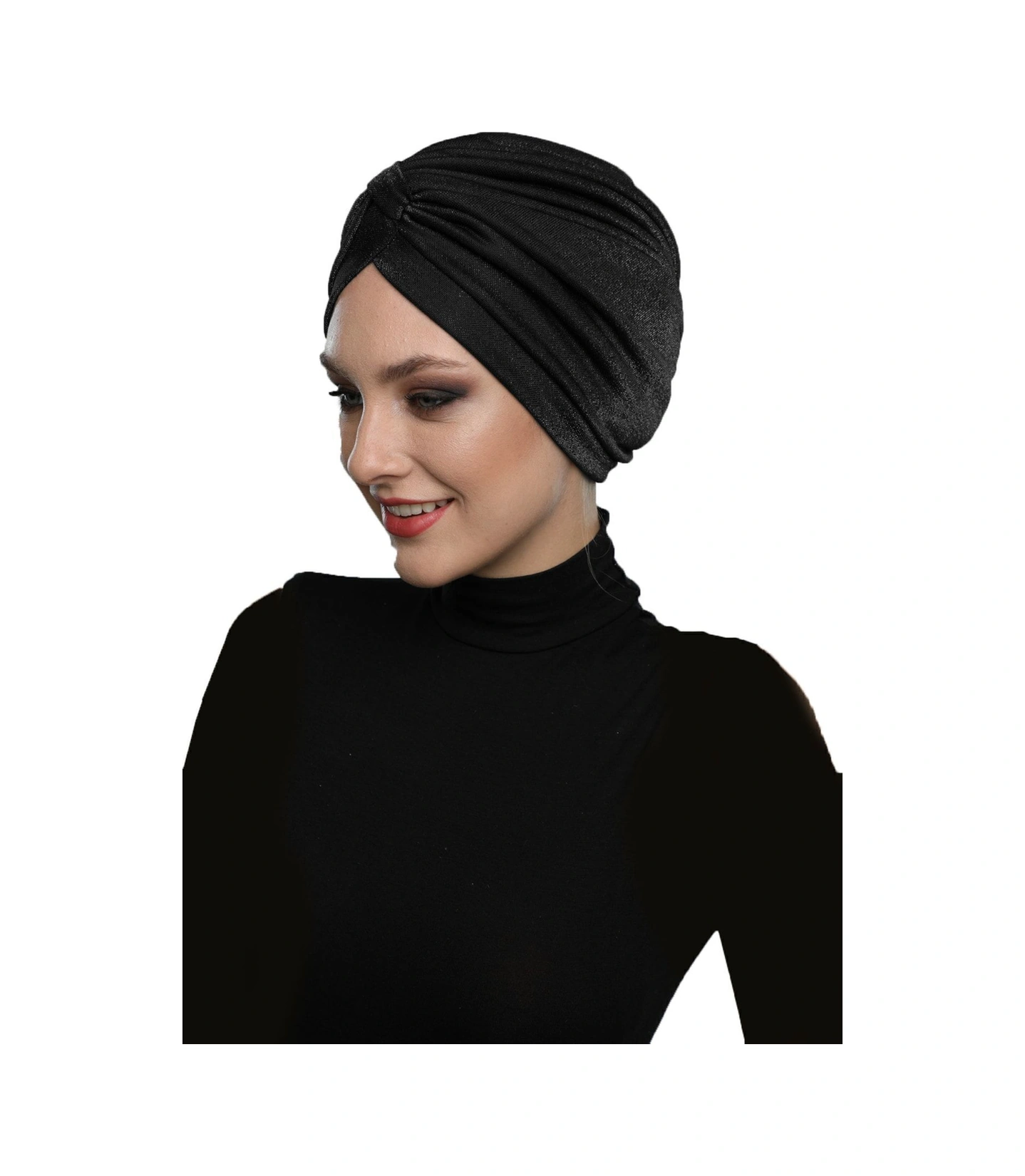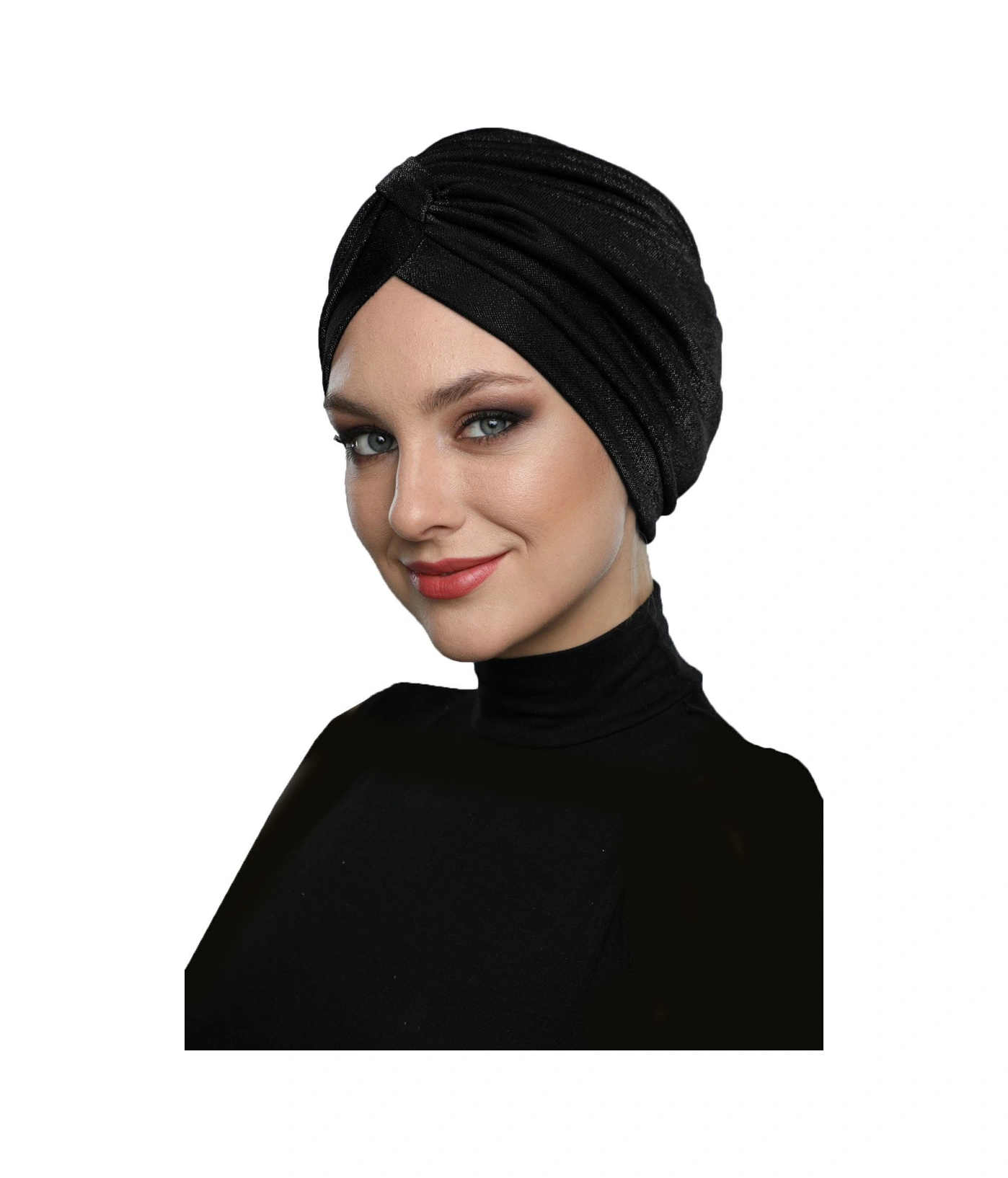 Simli Pike Çapraz Bantlı Astarlı Siyah Hazır Türban Tesettür Bone Abiye Siyah