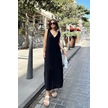 Siyah Askılı İthal Müslin Kumaş, Önü Ve Arkası V Yaka, Önden Yırtmaçlı, Maksi/uzun Salaş Elbise Siyah