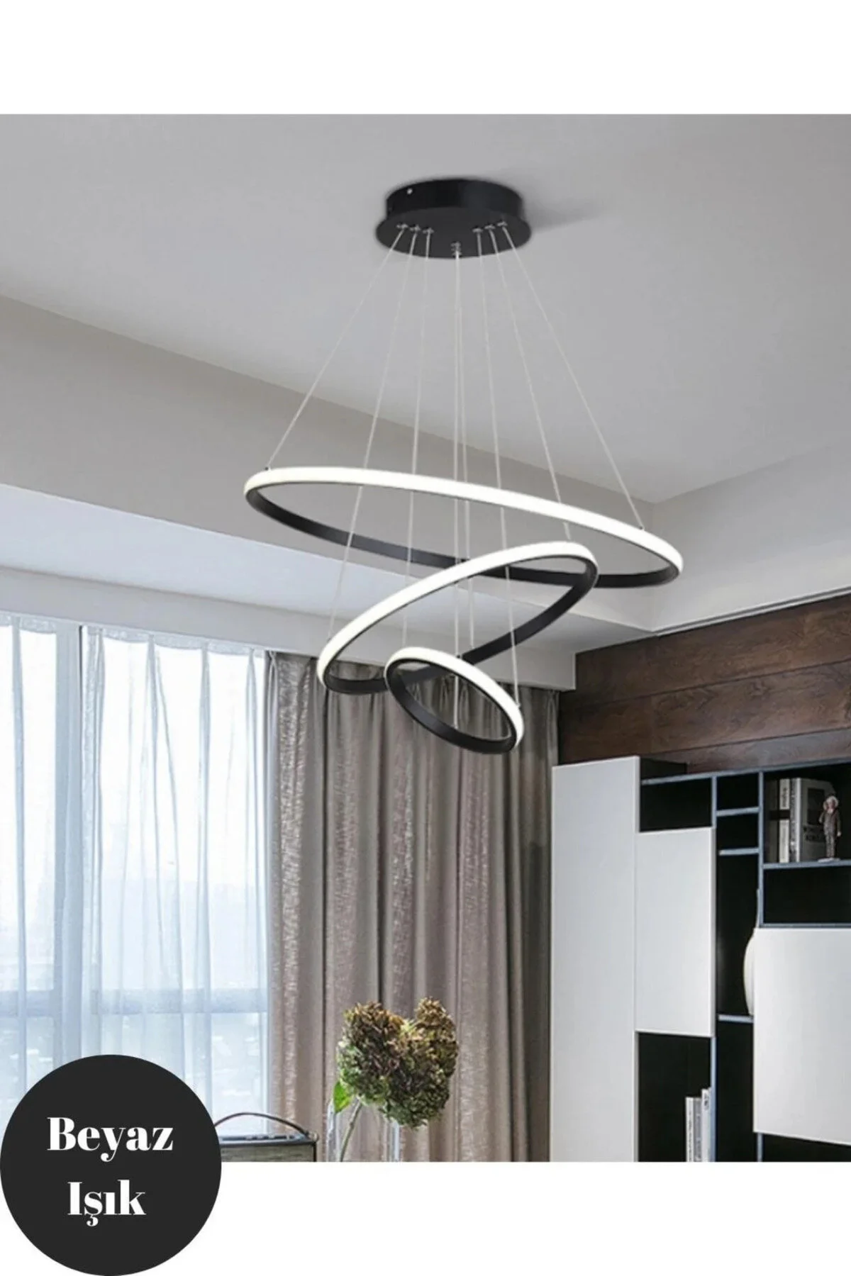 Siyah Kasa 3'lü Halka Ultra Süper Beyaz Ledli Modern Avize Beyaz