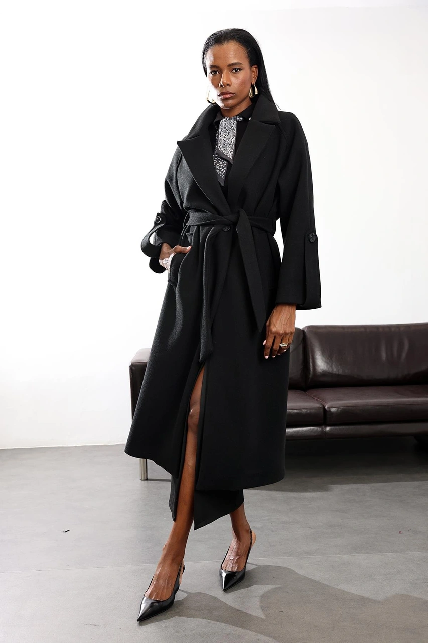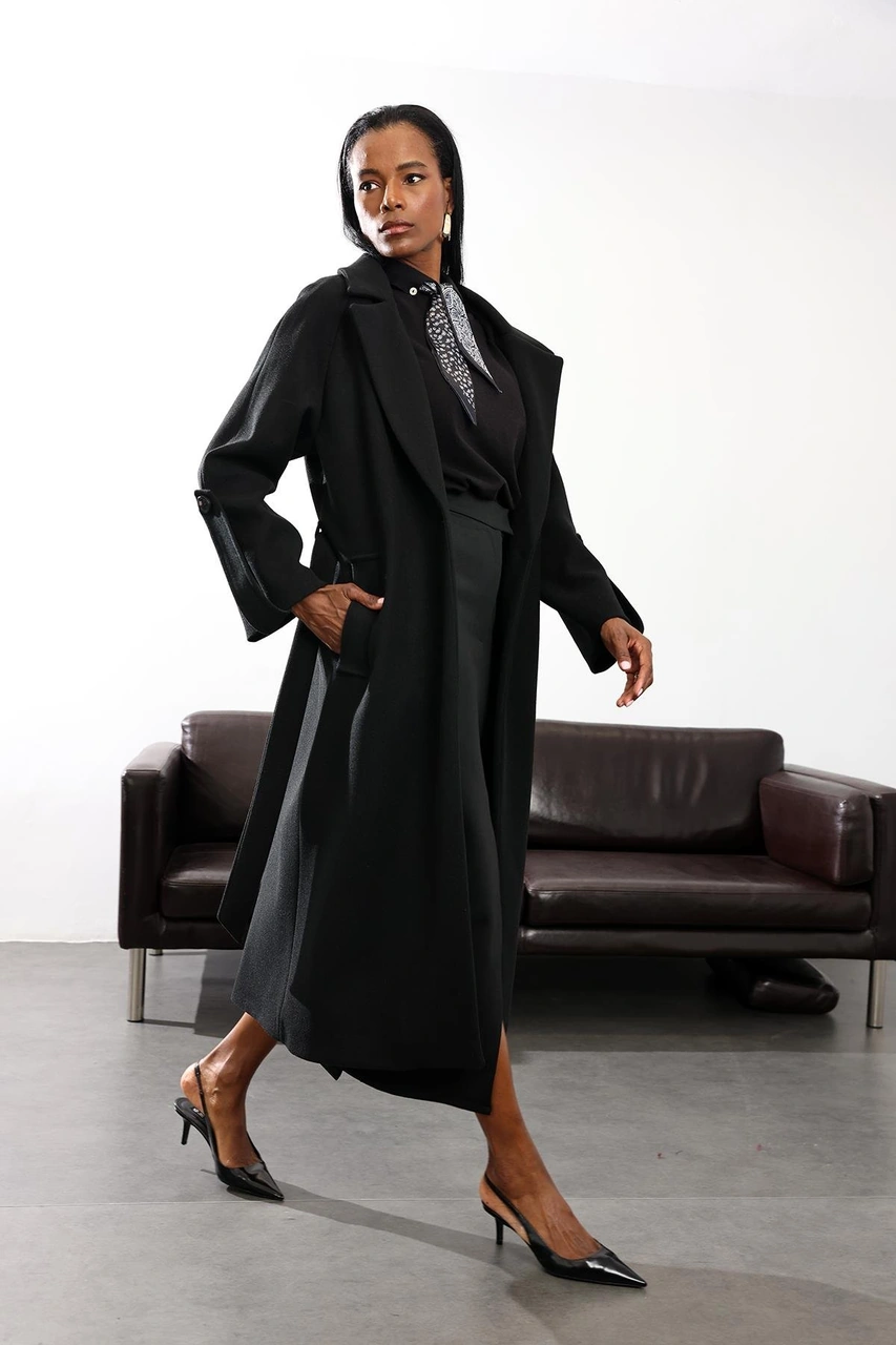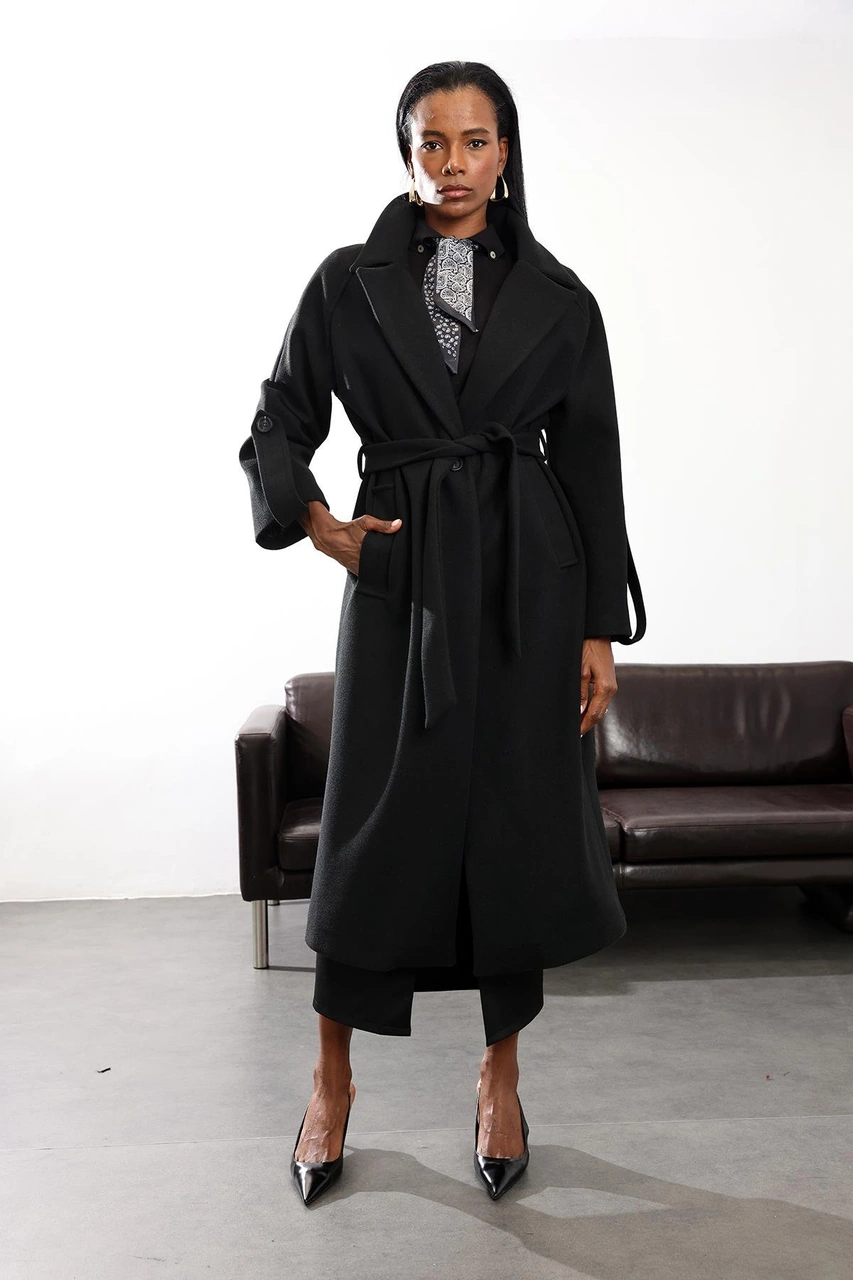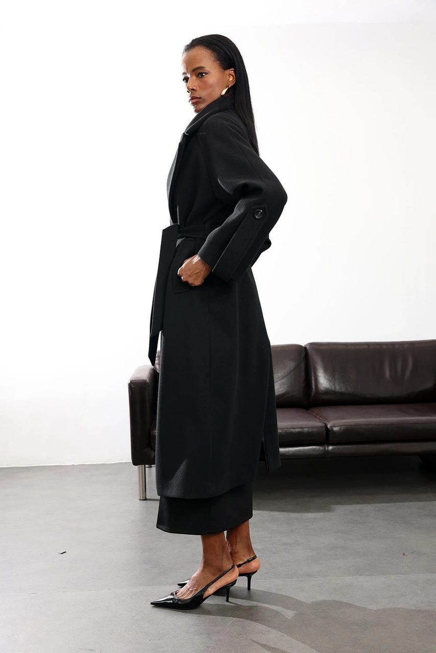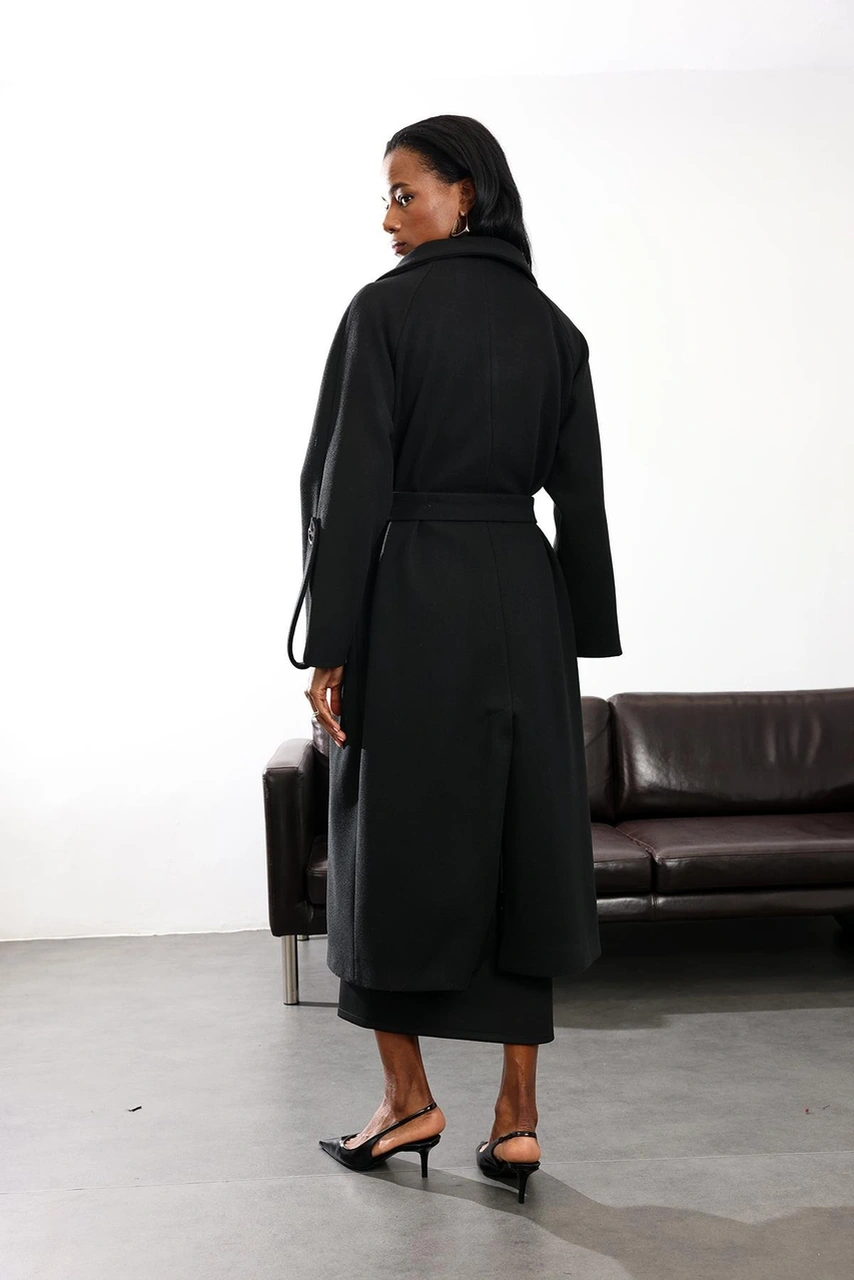 Siyah Kuşaklı Kaşe Palto 1146 Siyah