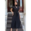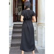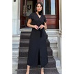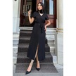 Siyah V Yaka, Kısa Kol, Airobin Kumaş, Omuz Detaylı, Kemerli/kuşaklı, Önden Yırtmaçlı Maxi Elbise Siyah
