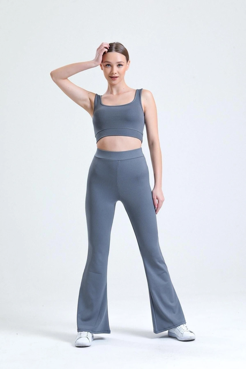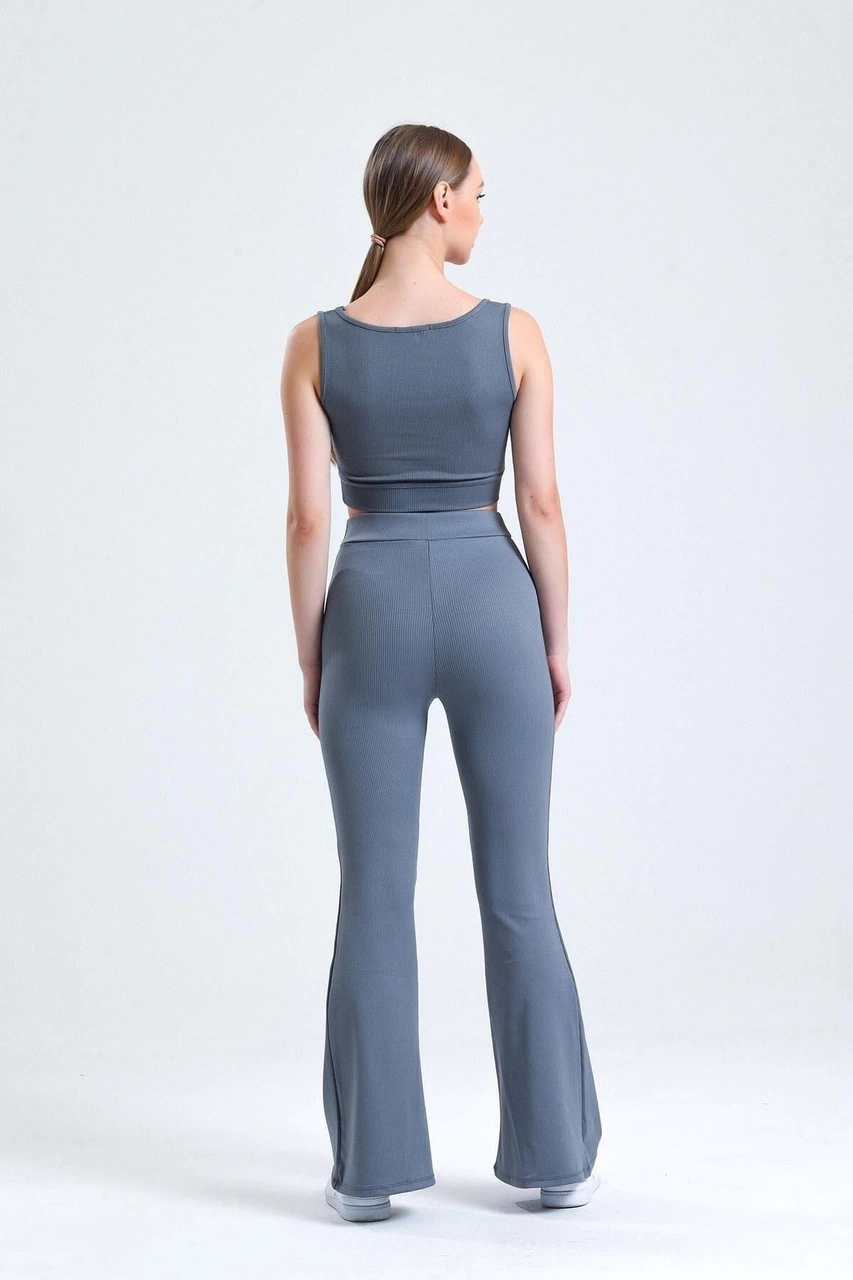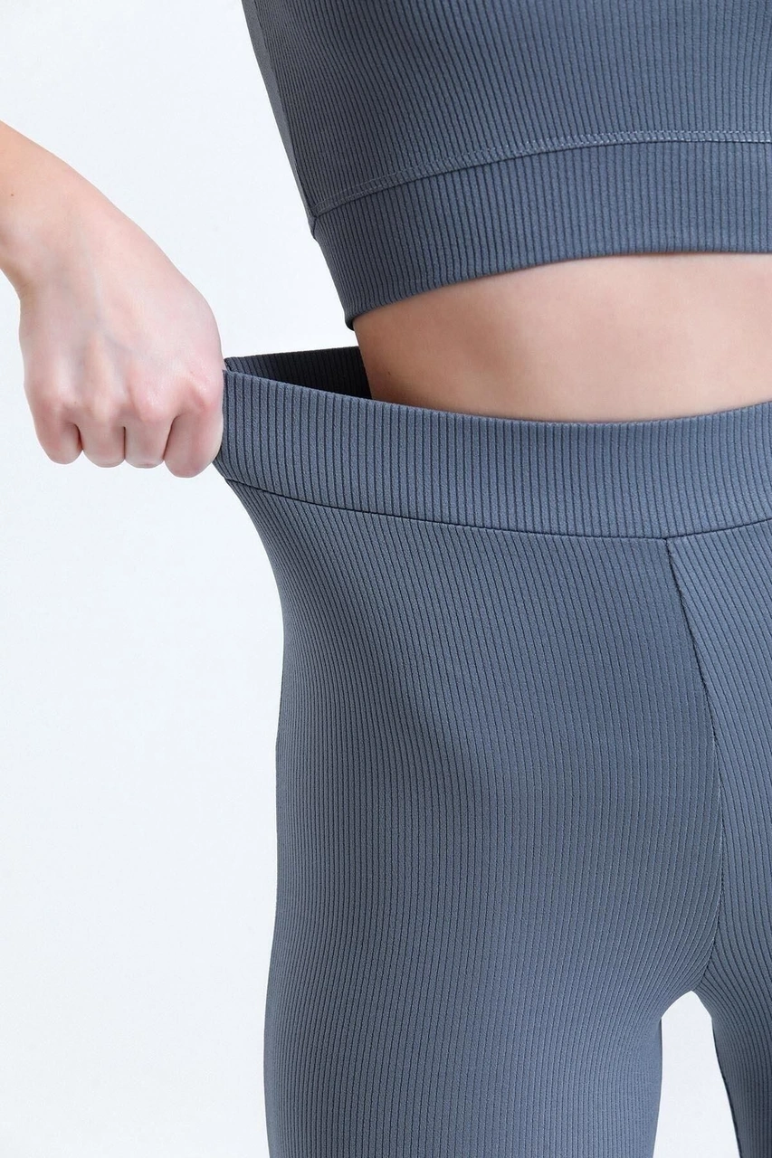 Siyah Yüksek Bel Fitilli Ispanyol Paça Interlok Örme Kadın Tayt Antrasit