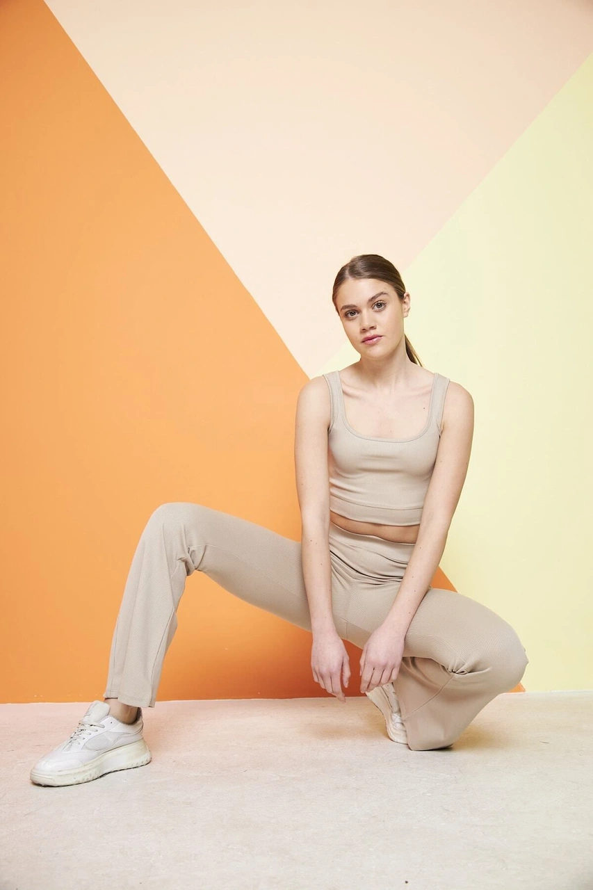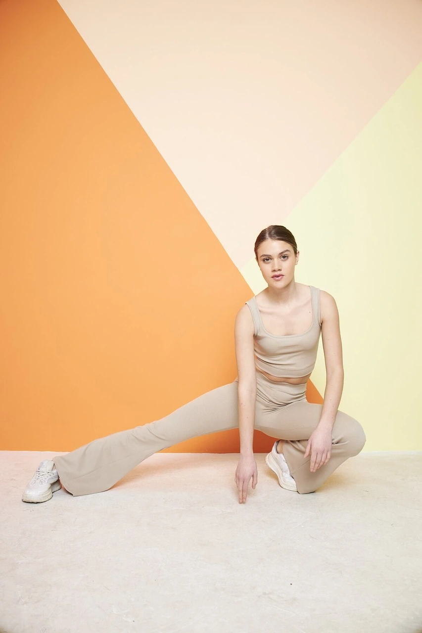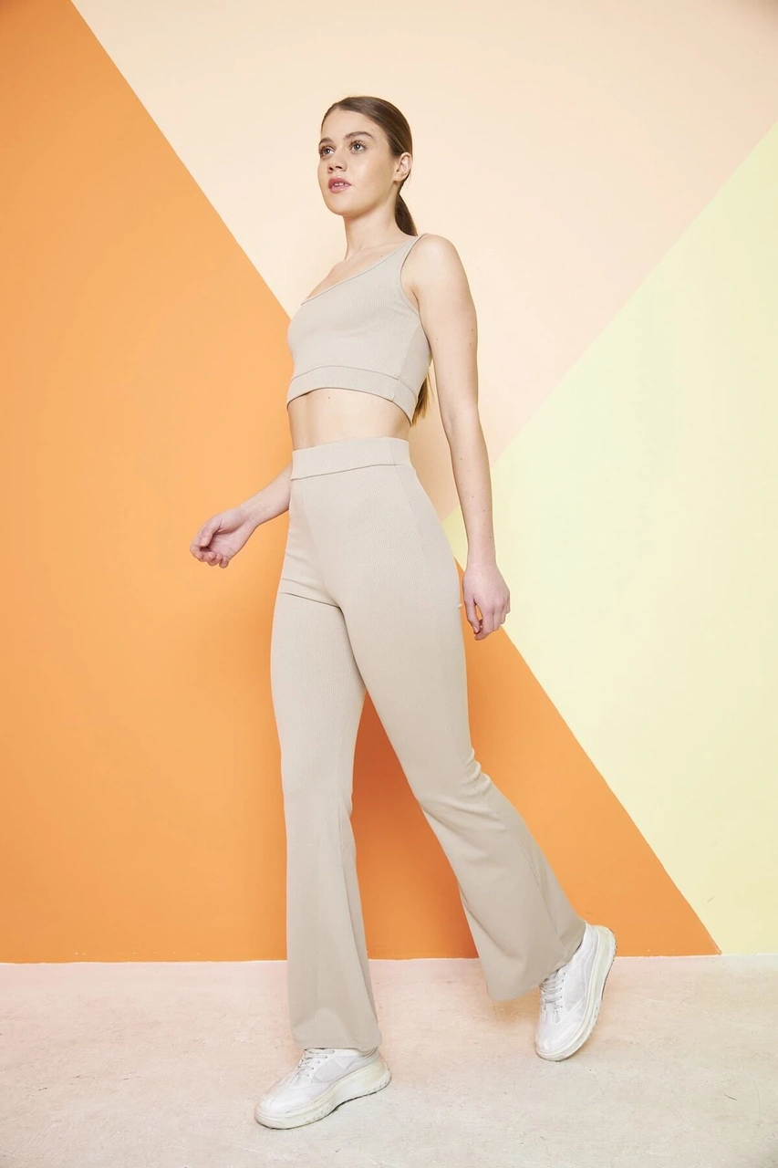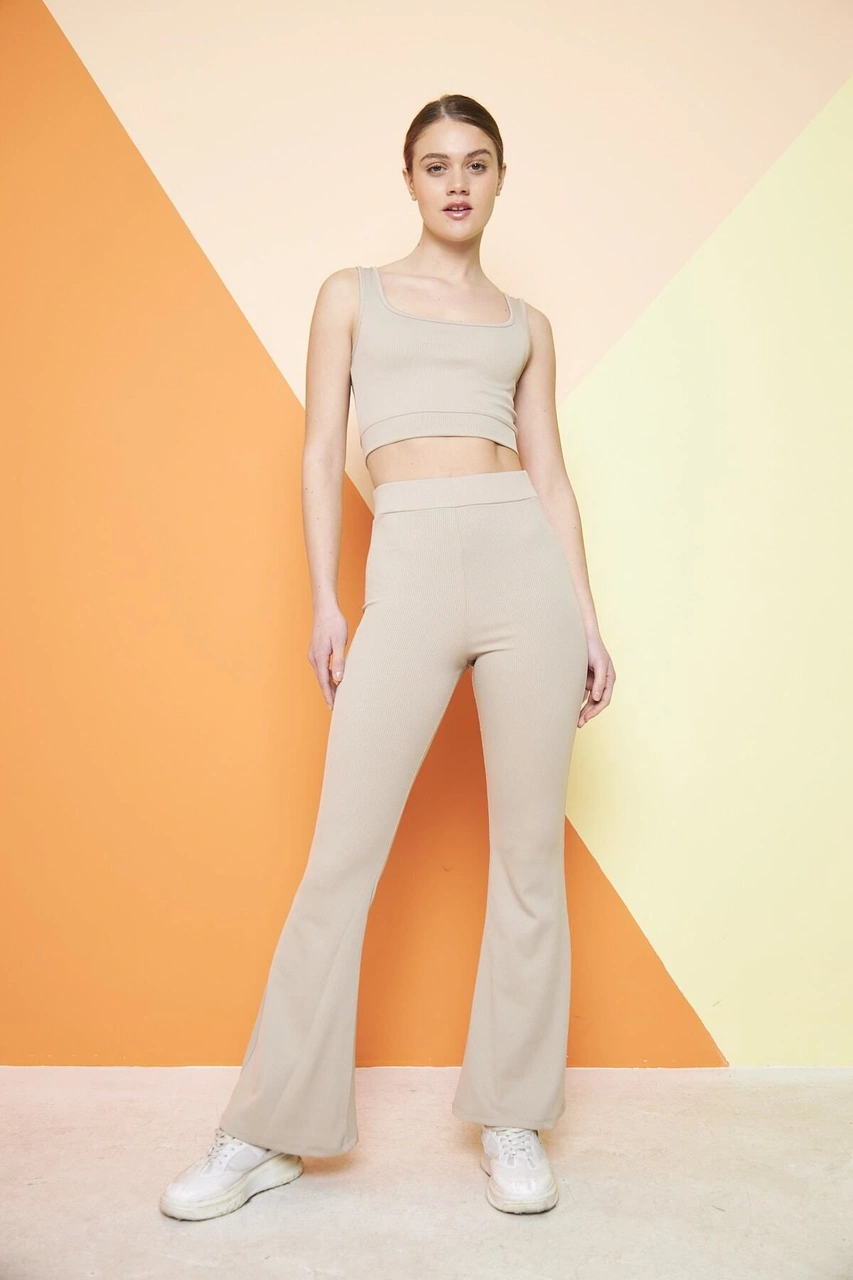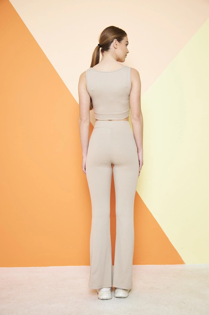 Siyah Yüksek Bel Fitilli Ispanyol Paça Interlok Örme Kadın Tayt Bej