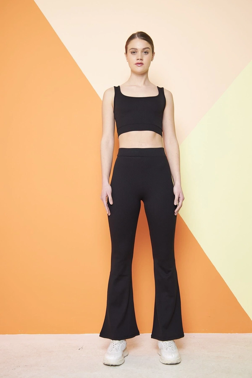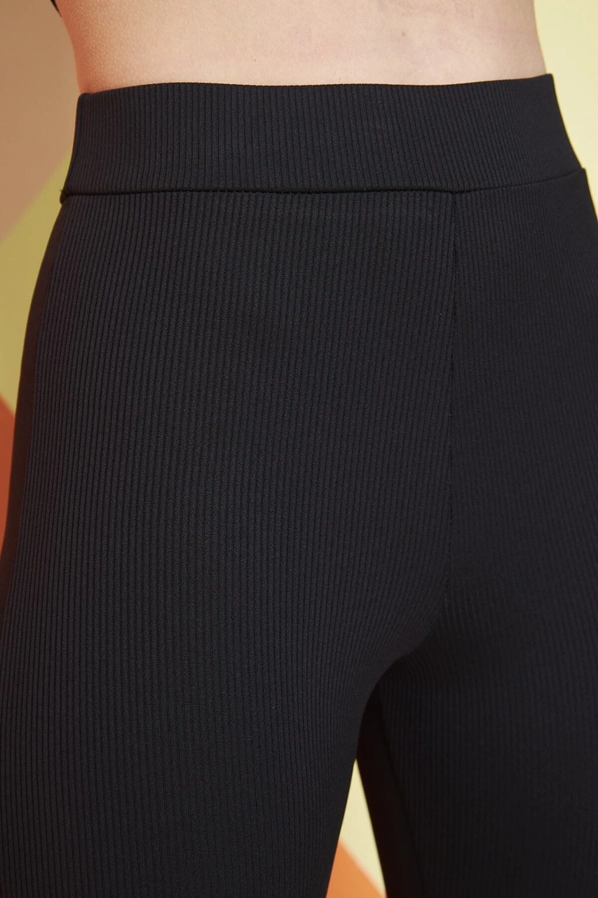Siyah Yüksek Bel Fitilli Ispanyol Paça Interlok Örme Kadın Tayt SiYAH