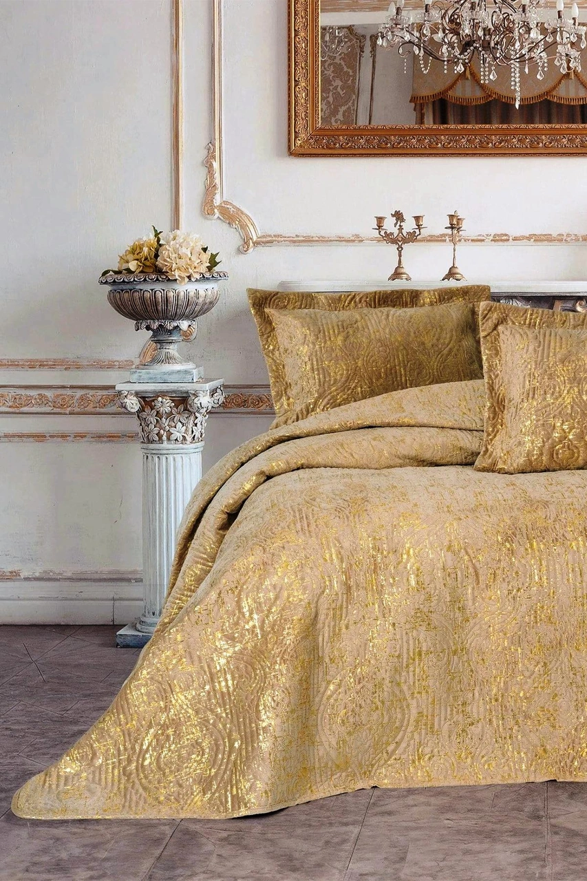 Smart Brillante Kahve Çift Kişilik Kadife Varaklı Yatak Örtüsü Seti Kahverengi