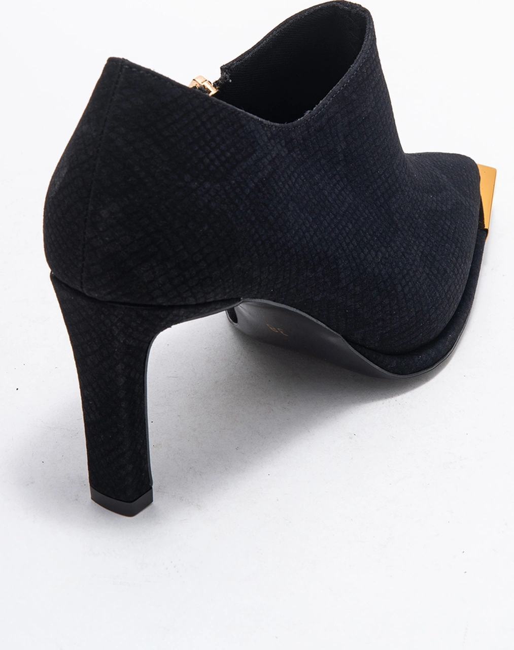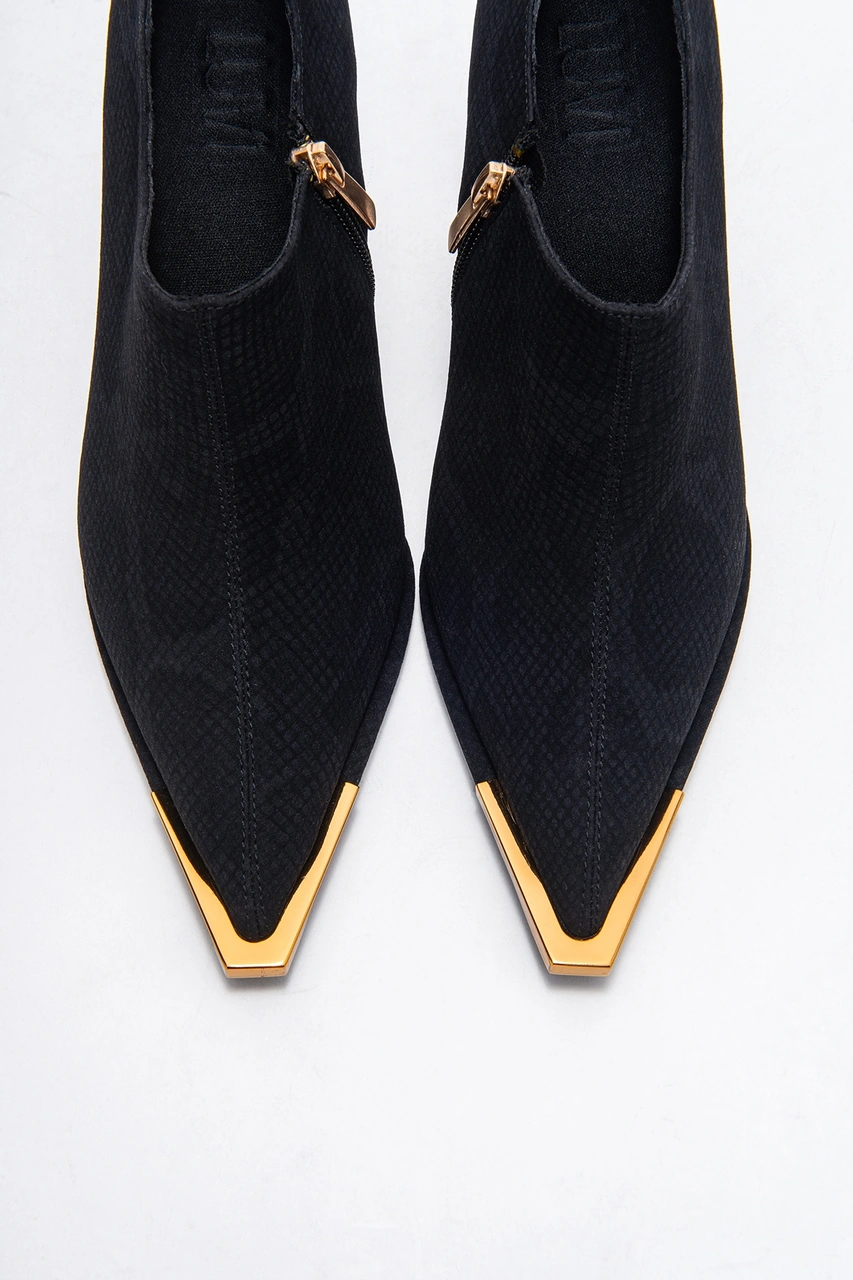 Sona Siyah Desenli Altın Detaylı Fermuarlı Kadın Bilekte Topuklu Ayakkabı Siyah Yılan