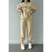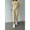 Studio Co Baskılı Bej T-shirt Eşofman Altı Takım - Oversize Bisiklet Yaka Bej