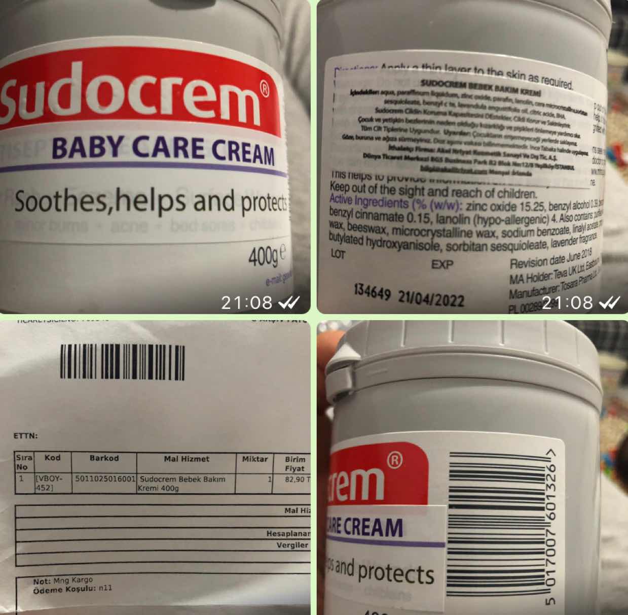 Ürünün üzerindeki etiket üzerine tekrar bir etiket daha yapıştırılmış altta Antiseptic Healing Cream yazıyor üstüne tekrar etiket basılmış ve Baby Care Cream yazıyor ayrıca fatura üzerindeki barkodla ürün üzerindeki barkod farklı belkide yurtdışı üründür bilemiyorum son kullanım tarihi 21/04/2022