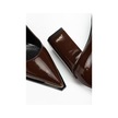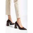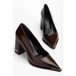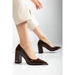 Suins Premium Verty Model Kadın Kalın Topuklu Burnu Taşlı Rugan Stiletto Ayakkabı Kahve