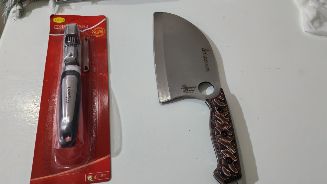 Bıçak 10 numara olmuş, 3 mm kalınlık güzel olmuş. 2 mm ince 4 mm kalın olurmuş. Sağ kısmı çok güzel olmuş avuç içini dolduruyor. Bıçak çeliği 4116 diye aldım. Ben çelikten anlamam firmaya güvenmek zorundayım. Çeliğin üzerinde lokma takımlarında olan bir işlem yapılmış, buda bıçağı kaliteli gösteriyor. Kılıfında çok hoş olmuş. Keşke gerçek deri olsaymış tadından yenmezmiş. Ama bu şekilde de çok güzel çekinmeden alabilirsiniz. Kesinliği de güzel.