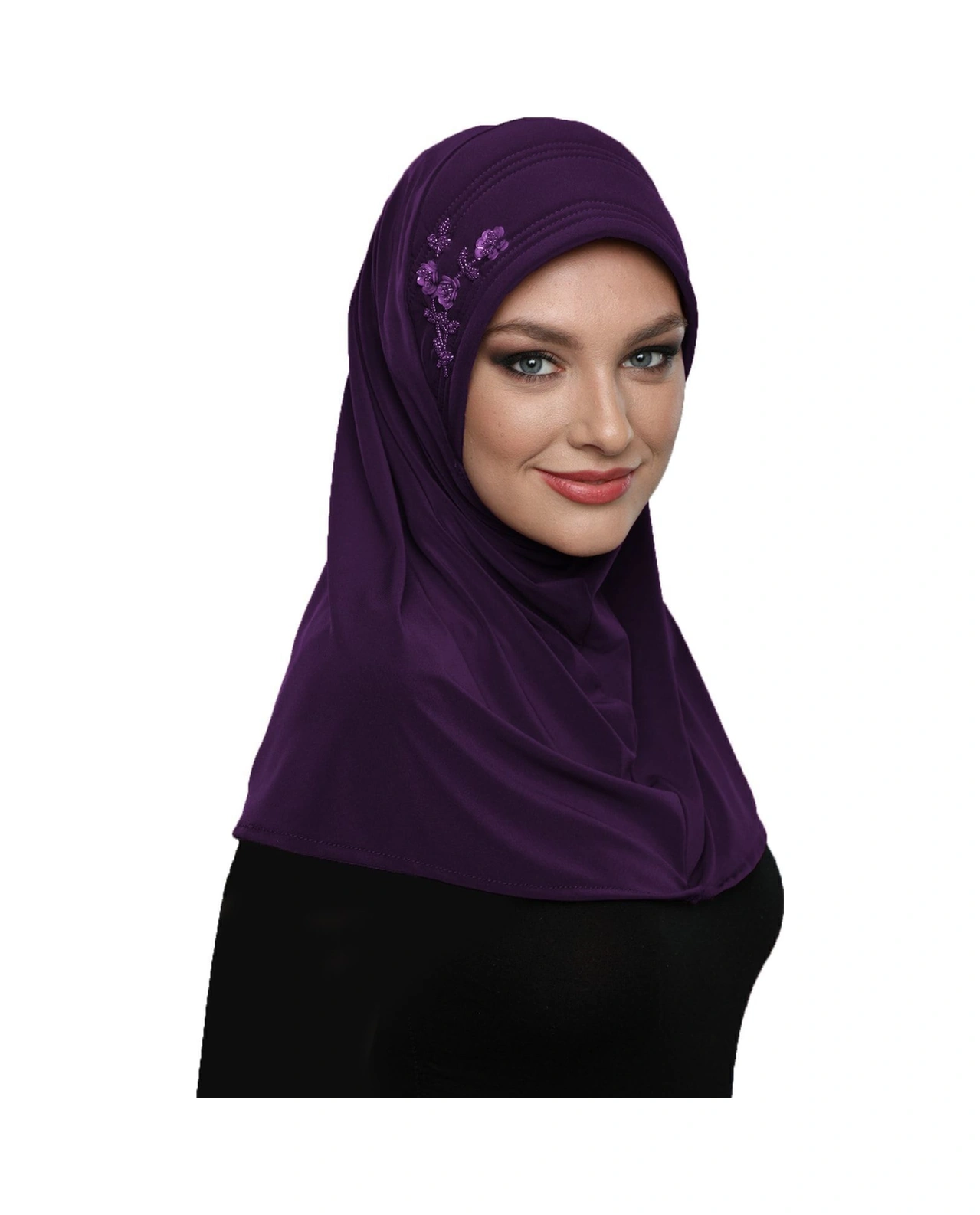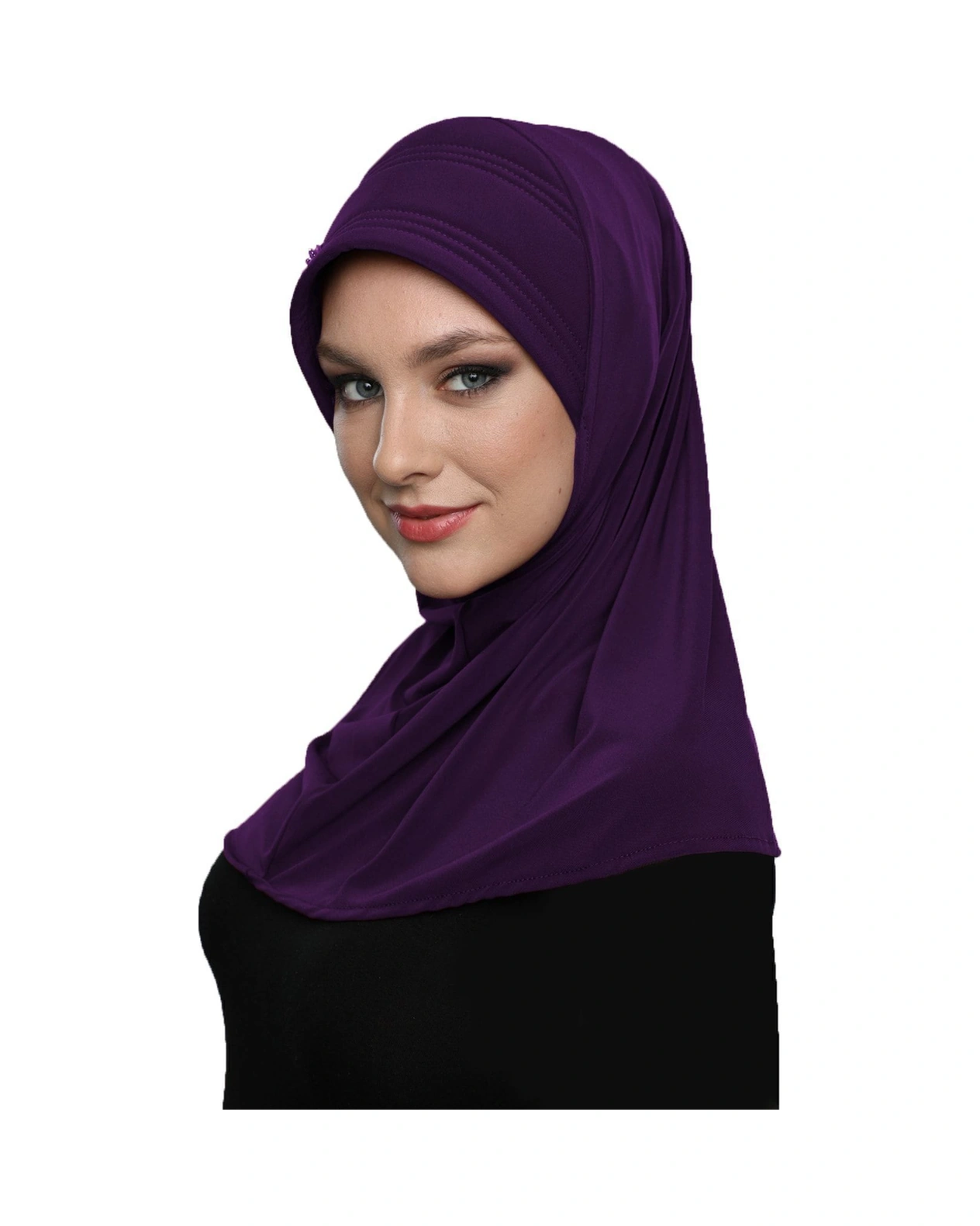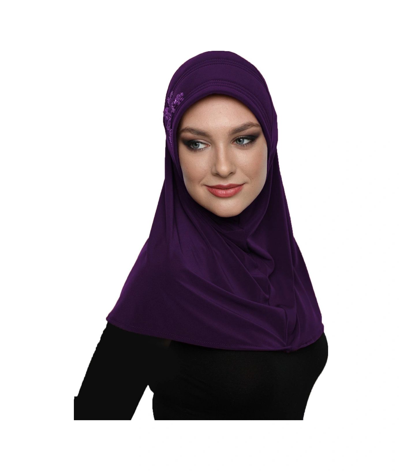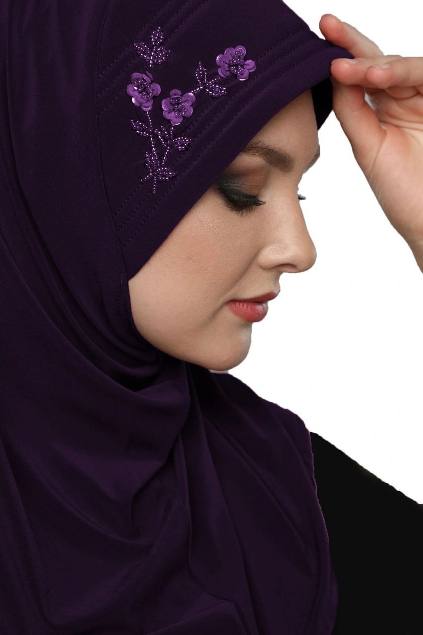 Takmatik Taşlı El Işi Boncuk Işlemeli Mor Hazır Türban Tesettür Bone Namaz Örtüsü Mor