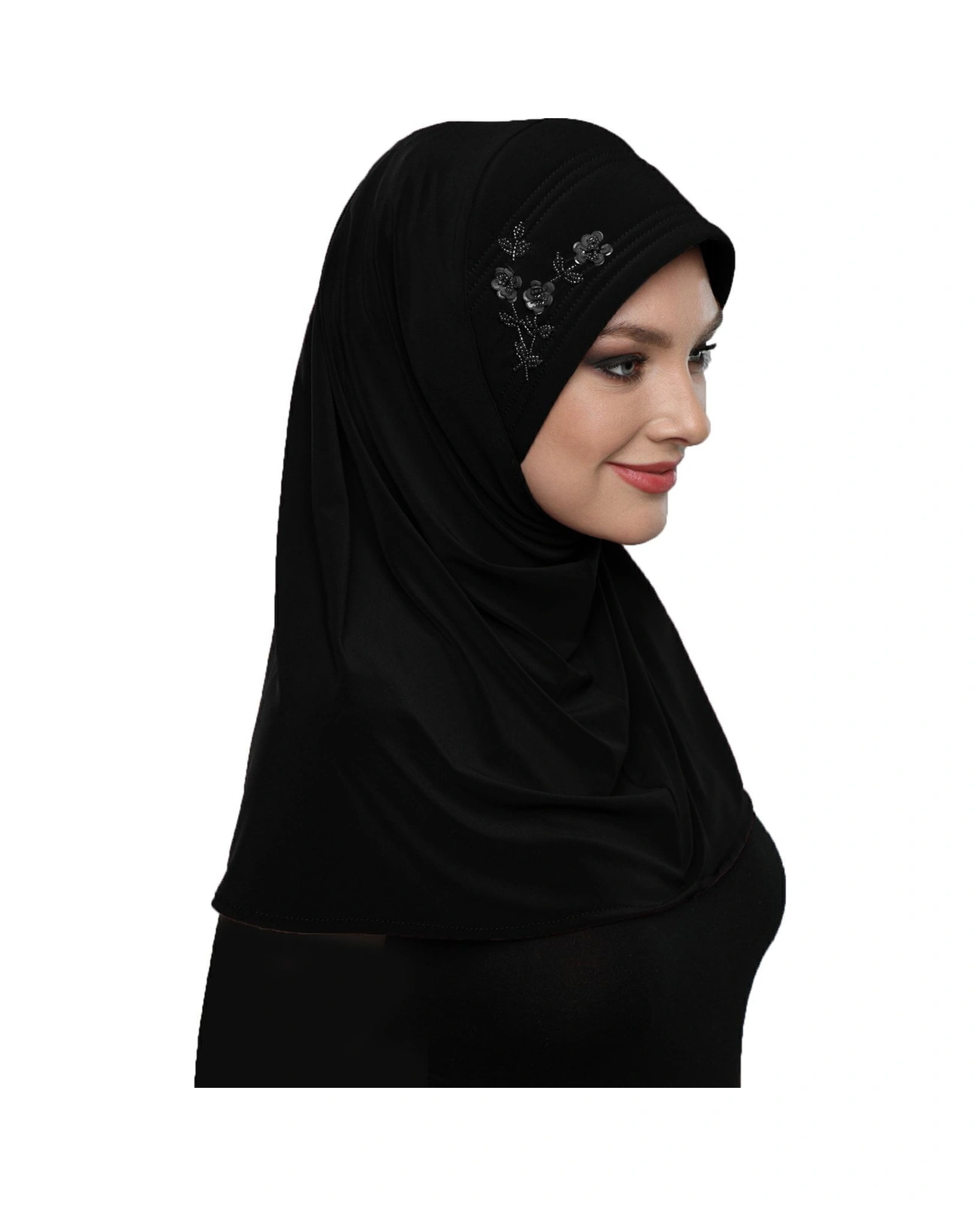 Takmatik Taşlı El Işi Boncuk Işlemeli Siyah Hazır Türban Tesettür Bone Namaz Örtüsü Siyah