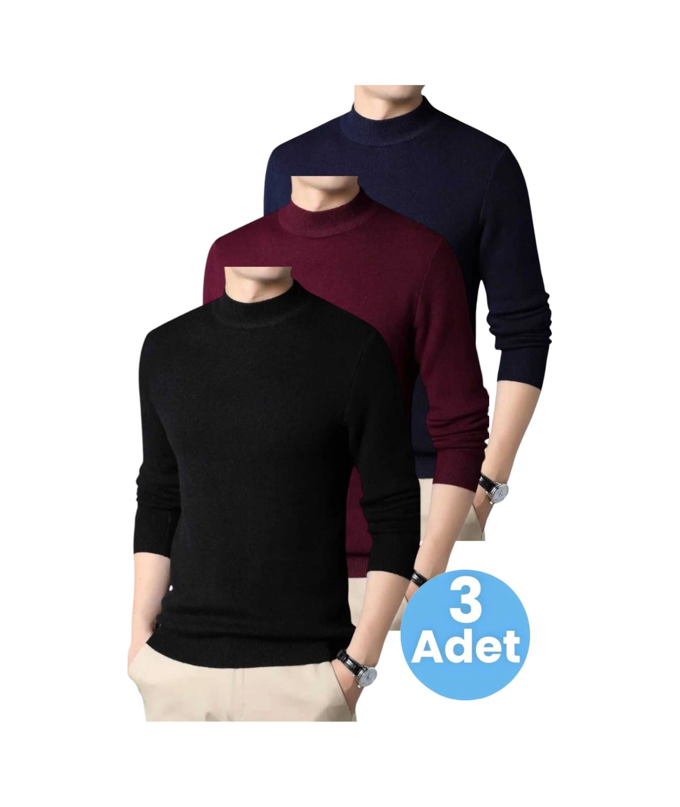 Tezzgelsin 3'lü Erkek Tüylenmeyen Yarım Boğazlı Triko Kazak Yarım Balıkçı Triko Kazak Siyah - Bordo - Lacivert