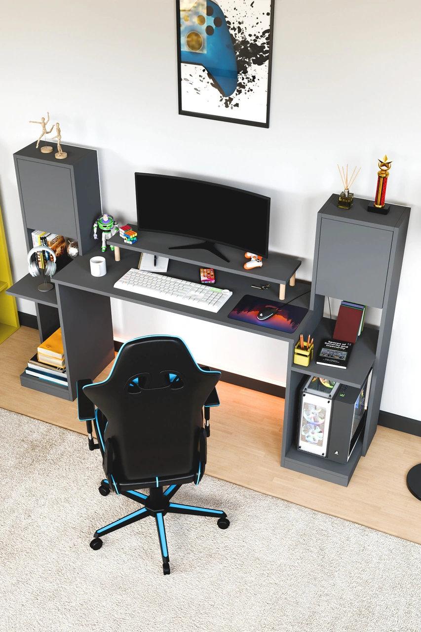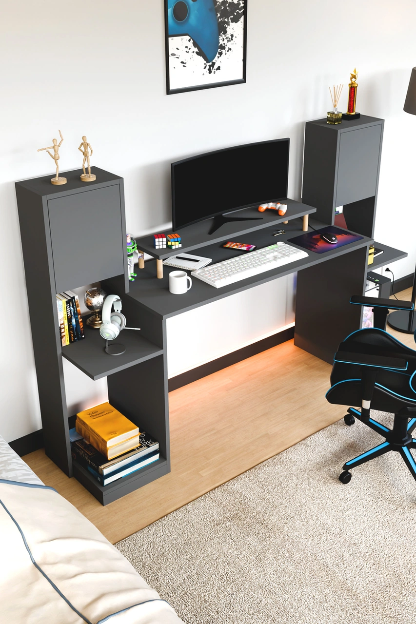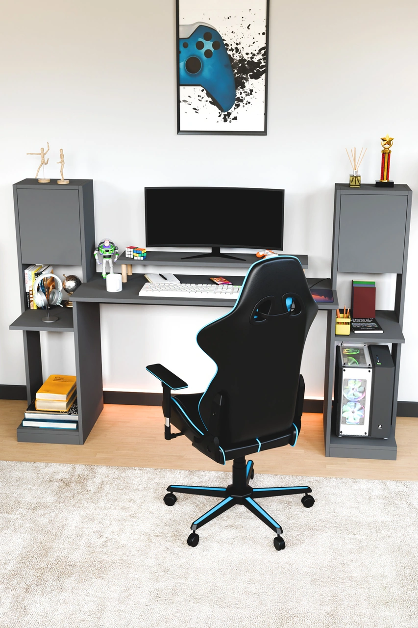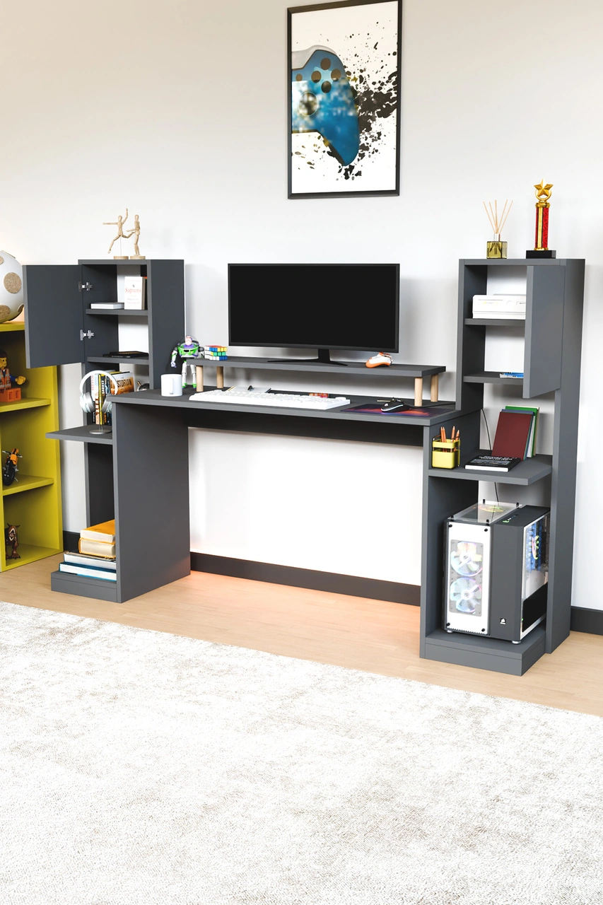 Throne Dolaplı, Kitaplıklı, Raflı Çalışma Masası, Bilgisayar Masası, Çocuk Çalışma Masası Antrasit Gri Antrasit