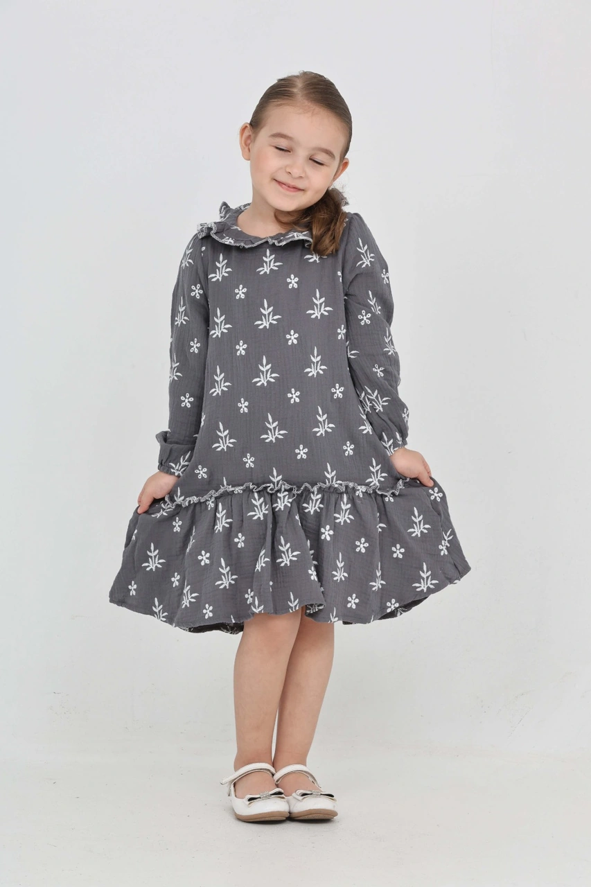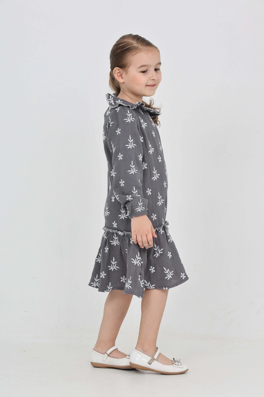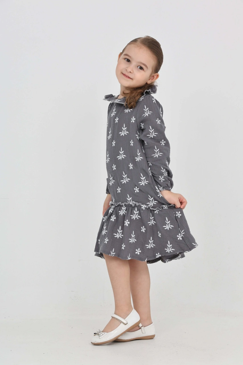 Toontoy Kız Çocuk Çiçek Nakışlı Bebe Yaka Elbise Füme