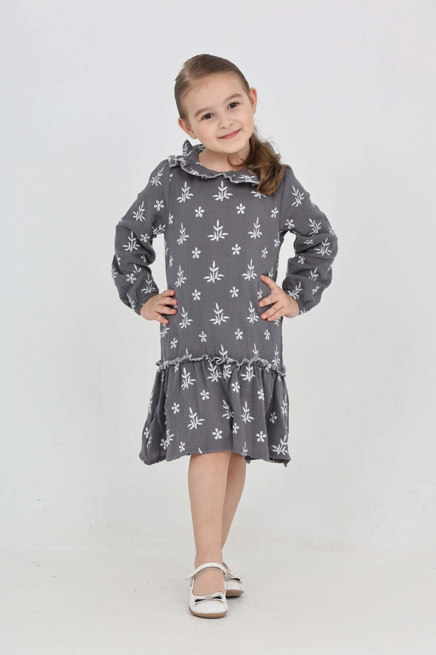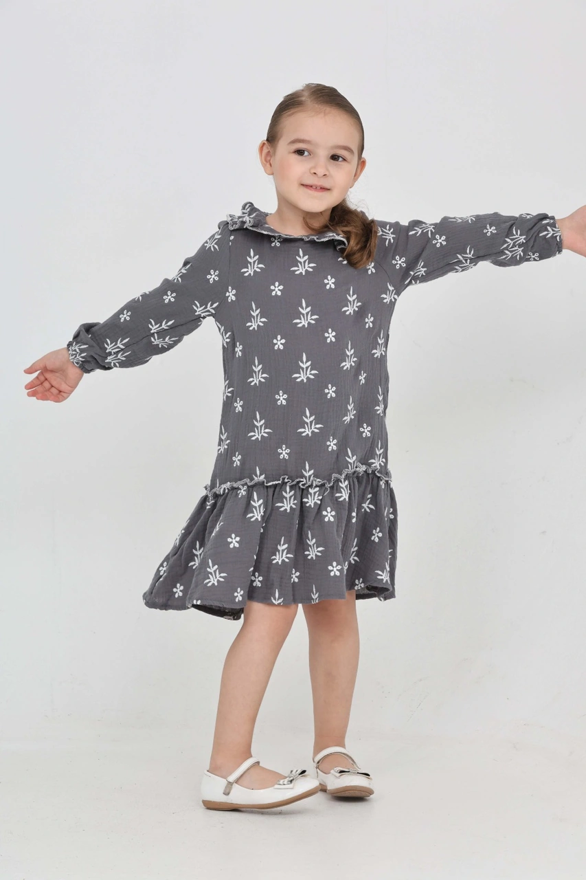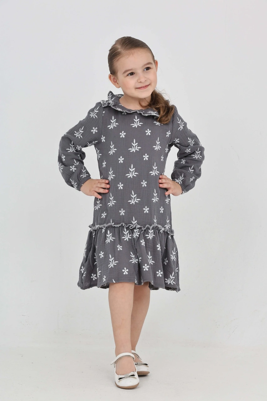 Toontoy Kız Çocuk Çiçek Nakışlı Bebe Yaka Elbise Füme