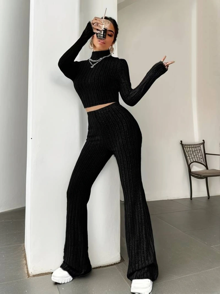Tua Moda Kadın Uzun Kollu Balıkçı Yaka Krop Ve Pantolon Şardonlu Kaşkorse Ikili Takım Siyah