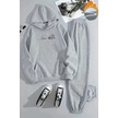 Unisex Love Çizgi Baskılı Kapüşonlu Gri Eşofman Takımı - Kışlık Şardonlu Kumaş Gri