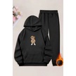 Unisex Siyah Nyc Ayıcık Baskılı Eşofman Kapüşon- Kışlık Şardonlu Kumaş Siyah