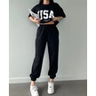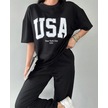 Usa T-shirt Eşofman Altı Jogger- Siyah Baskılı Alt Üst Eşofman Takım Oversize Bisiklet Yaka Siyah