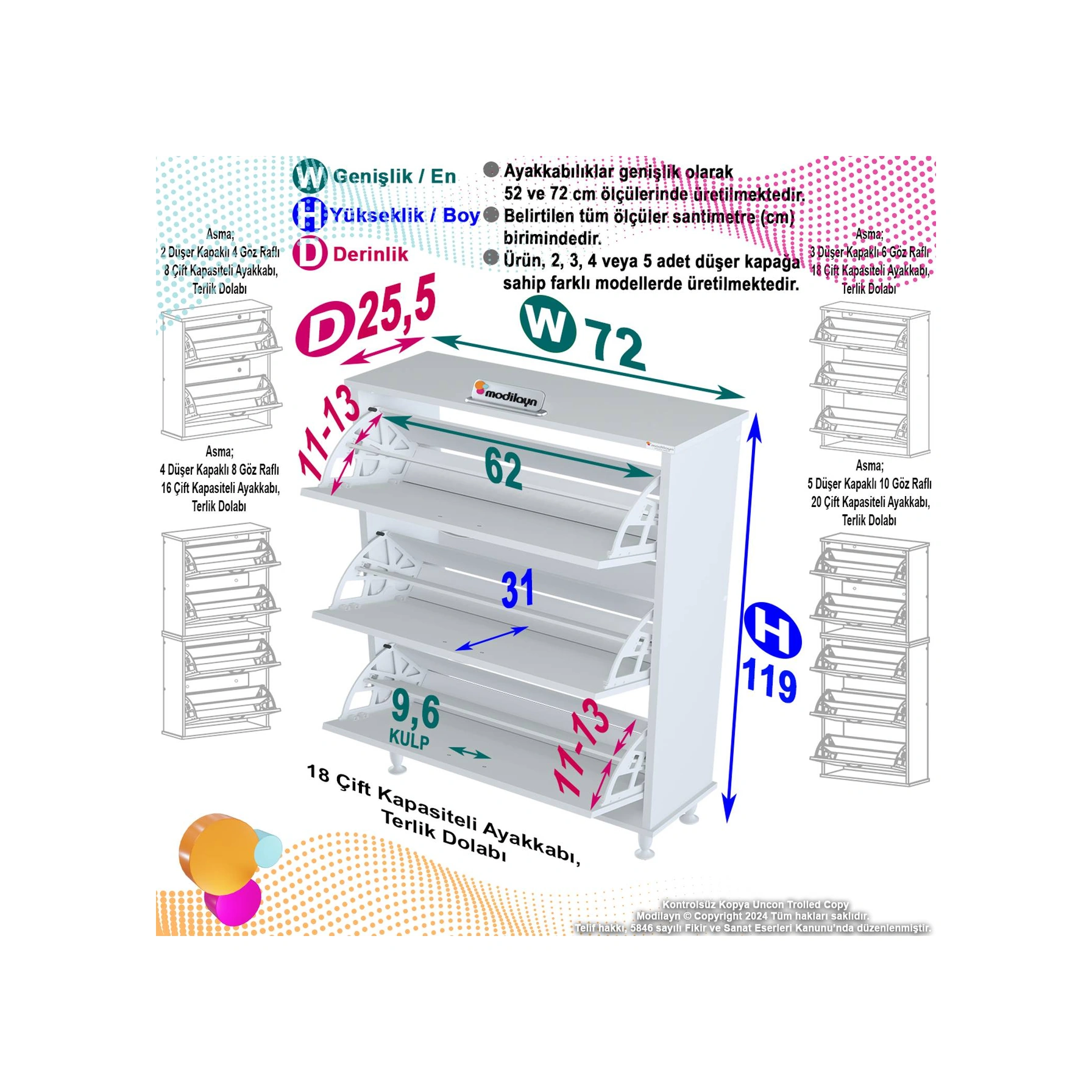 Uygar Beyaz Renk Kapı Önü Ayakkabılık 3 Düşer Kapak 6 Göz Ayakkabılık 72x119x25,5 Cm Beyaz