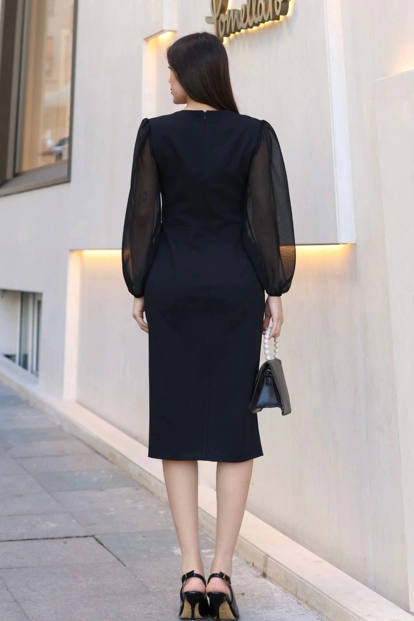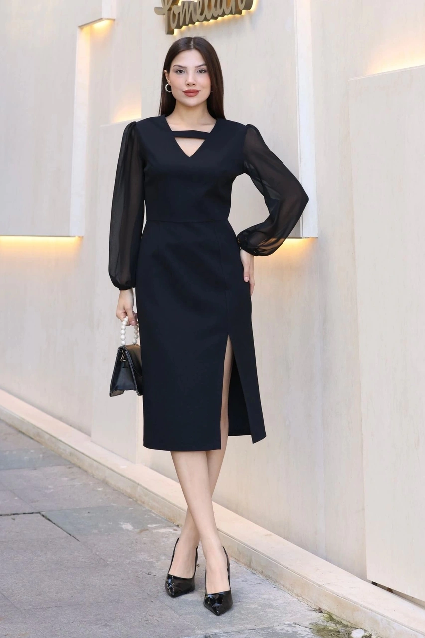 V Yaka Şifon Kollu Yırtmaçlı Midi Elbise 6015-siyah Siyah