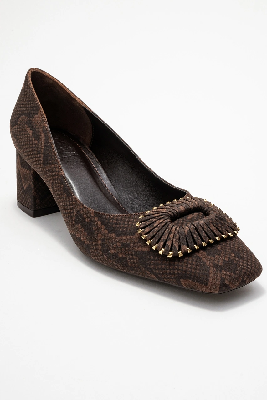 Velora Kahverengi Desenli Tokalı Kadın Kalın Topuklu Ayakkabı Kahverengi
