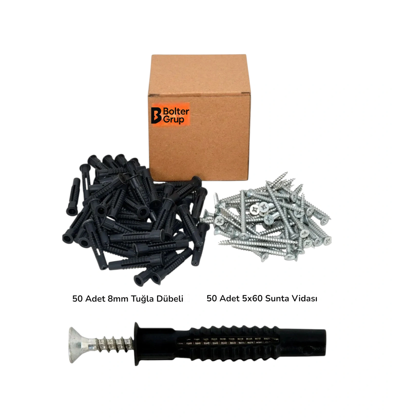 Vida Ve Dübel Seti 50 Adet 5x60 Mm Sunta Vidası Ve 50 Adet 8mm Siyah Tuğla Beton Boşluk Dübel -