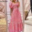 Vonda Yaz Kadın Ekose Kapalı Omuz Pilili Parti Uzun Elbise Zarif Ekose Tunik Ruffled Hem Gevşek Artı Boyutu Siyah