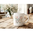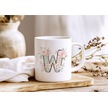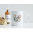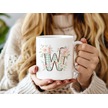 W Harfli Çiçek Desenli Kupa Bardak - Ekose Desenli Yeşil Pembe Desenli Tasarım - Kişiye Özel Hediye Beyaz
