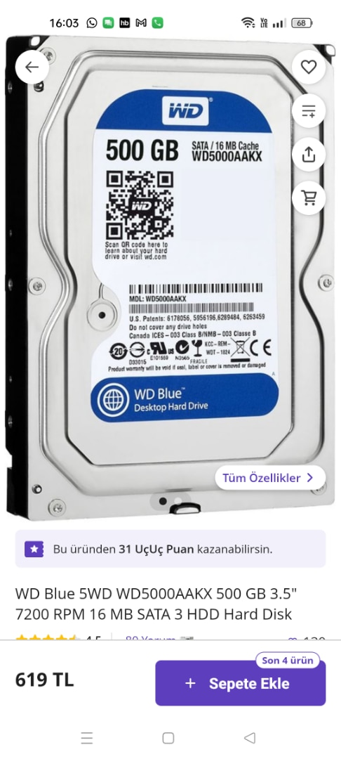 WD Blue 5WD WD5000AAKX 500 GB 3.5" 7200 RPM 16 MB SATA 3 HDD
